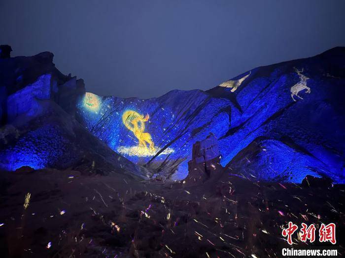5月3日晚,甘肃张掖市七彩丹霞旅游景区万象土林谷举行《阿兰拉格达》沉浸式梦幻山谷光影演绎吸引游客。 杨艳敏 摄