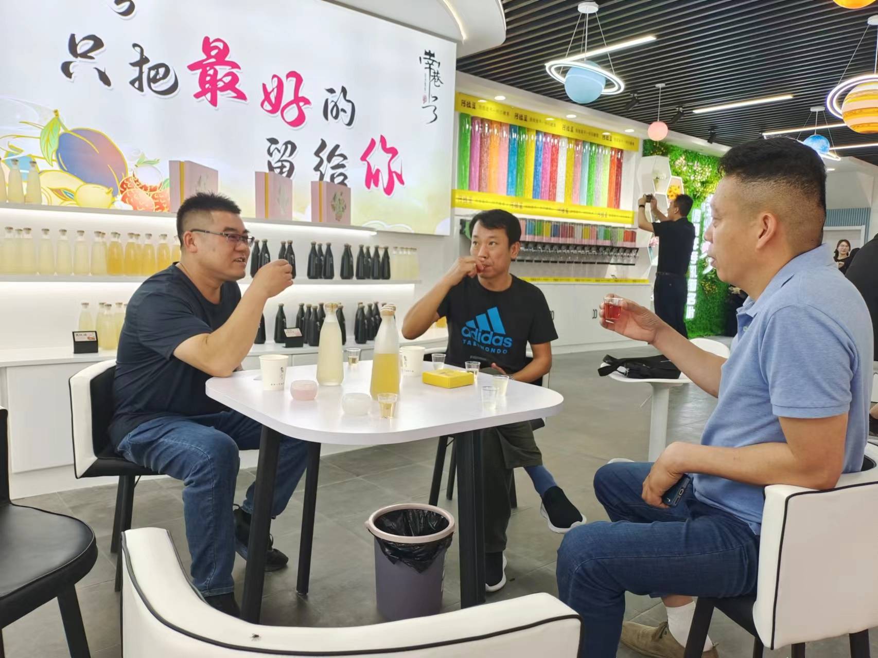 转眼间,几人悠坐吧台边,正在品酌那透着琥珀色的晶莹剔透的花果美酒。有荔枝酒、百香果酒、青梅酒,还有那抹诱人的红——玫瑰花酒,随着几张“贪婪”嘴巴的一吸一合中,藏不住的满足感溢在脸上。