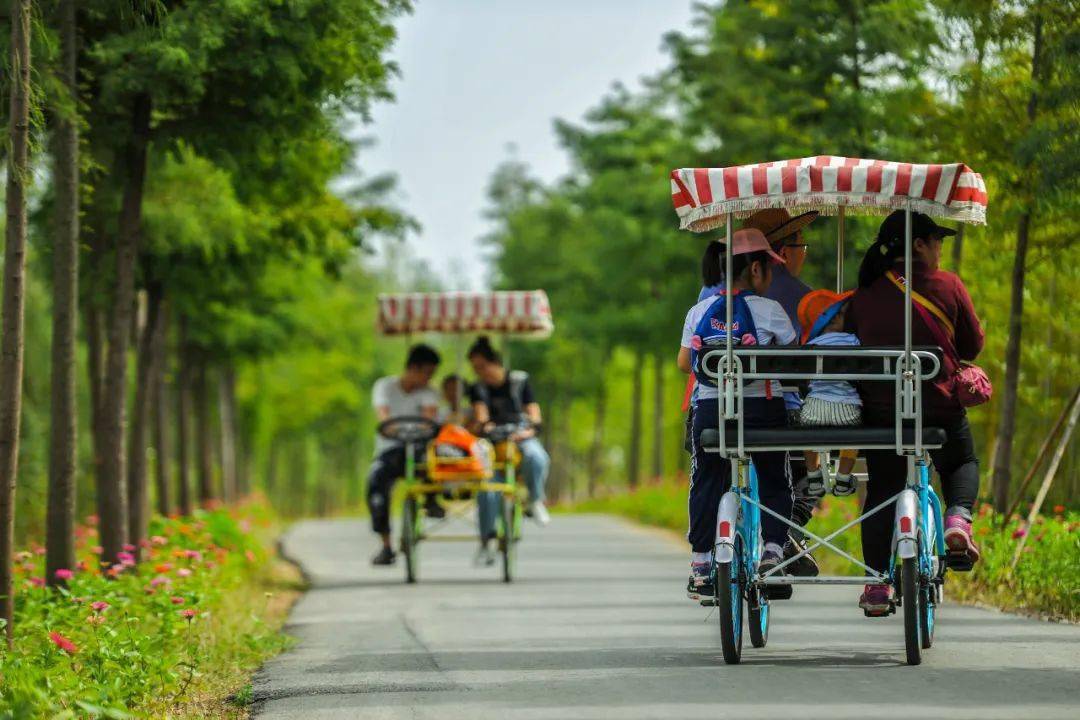 在阳光温柔地照耀下,踩着脚踏车,与孩子一起穿过花海与湖水,陪伴也是一道靓丽的风景。