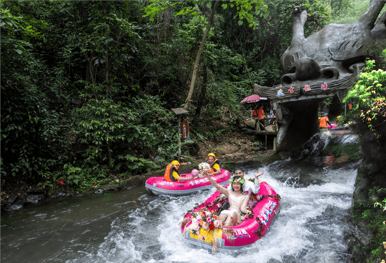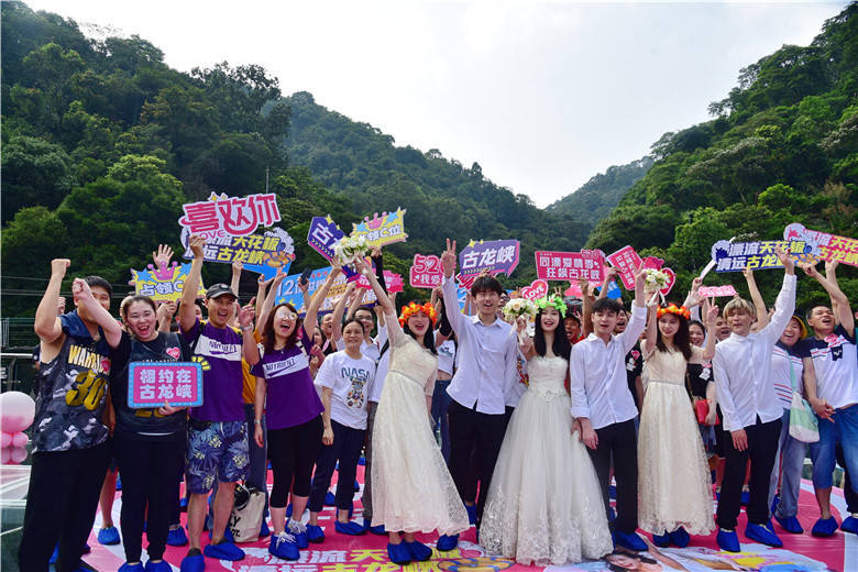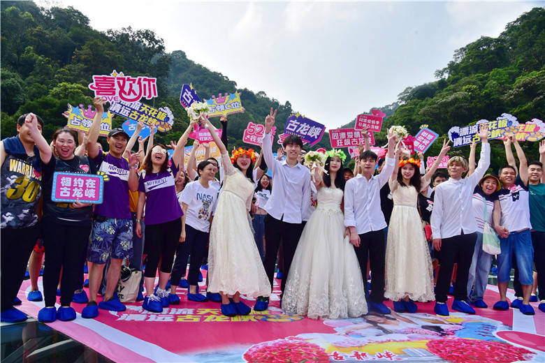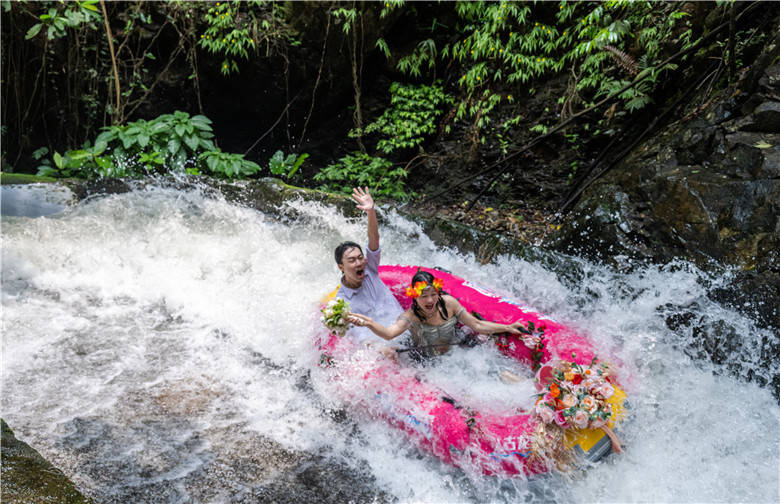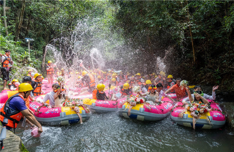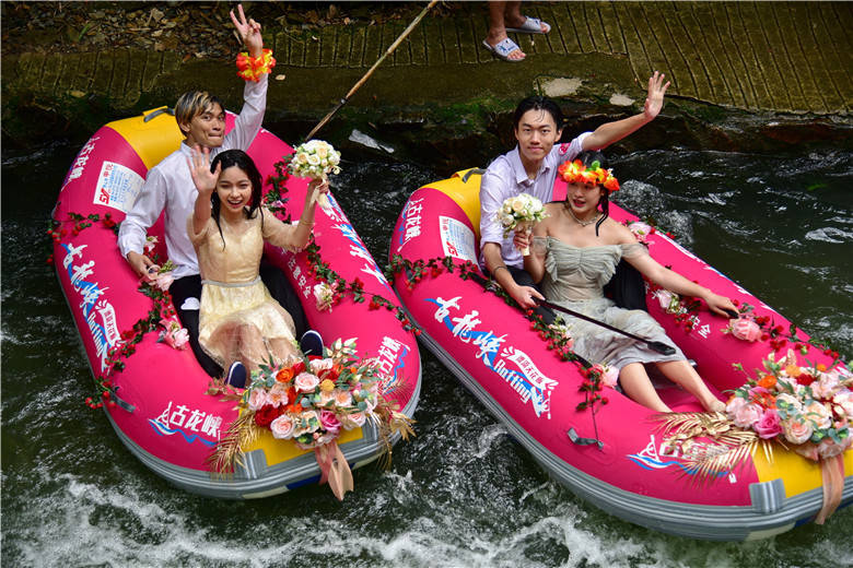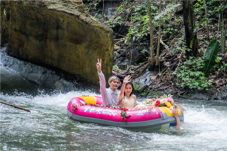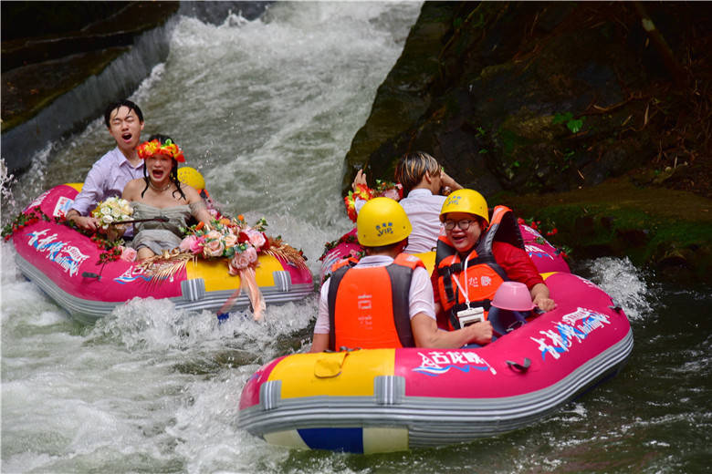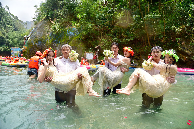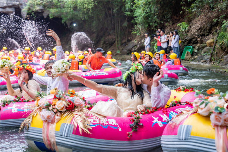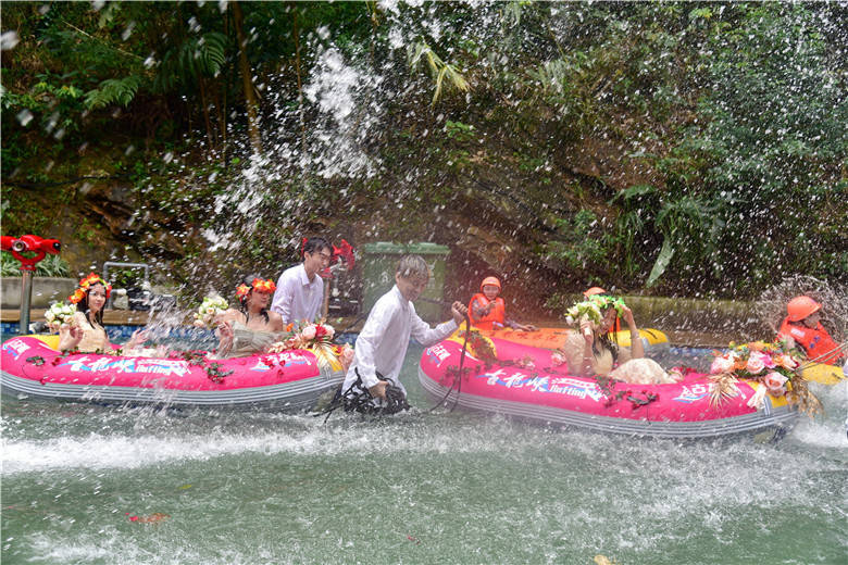 今年520节日,清远古龙峡针对现代年轻人,举办了“同漂爱情季,狂飙古龙峡”系列活动,其中一项活动就是漂流婚礼。3对新人在99对情侣的簇拥下,来到被有着“漂流天花板”美誉的古龙峡举行了一场别具一格的漂流婚礼,将惊险刺激的漂流活动和温馨浪漫的婚礼相结合,既简单热闹,又低碳环保。