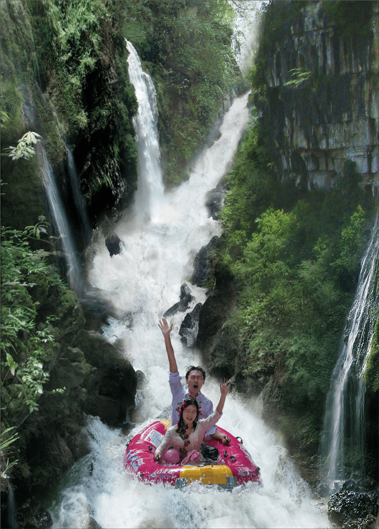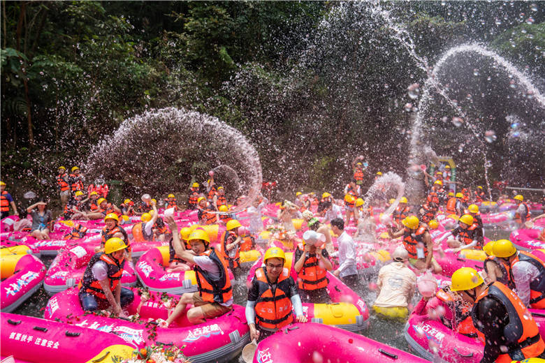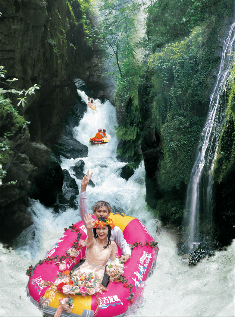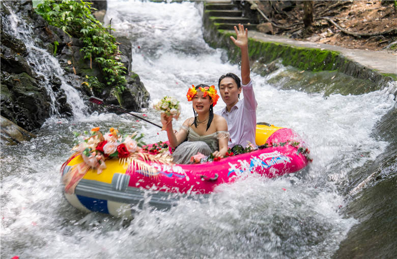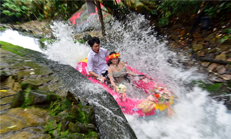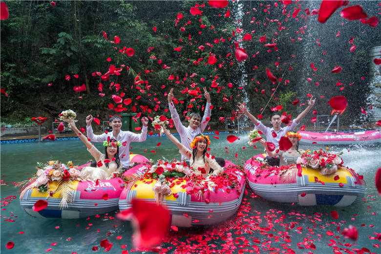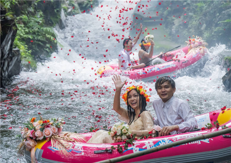 河道上,新人们与恋人们的粉红漂流艇一艘接一艘,在漂流河道上飞驰,穿激流、越险滩、击白浪,在飞舟浪尖的激荡中,体验人生四大喜事的“洞房花烛夜”的快乐,还有“轻舟已过万重山”的人生快意,艇上的新人与恋人的爱情也有了不一样的寓意。新人们与恋人们的欢呼与尖叫声交织成了他们婚礼的交响曲。