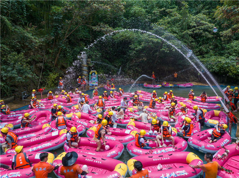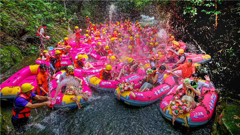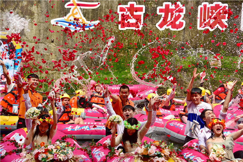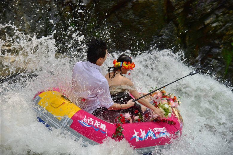 古龙峡收漂点河道宽阔,这里成了热闹的海洋,99对情侣与游客给3对新人们闹一次“水上洞房”,水花飞溅,粉艇直飞。游客们纷纷拿起各种“武器”,将水花洒向新人们,水花代表游客给新人们的祝福。