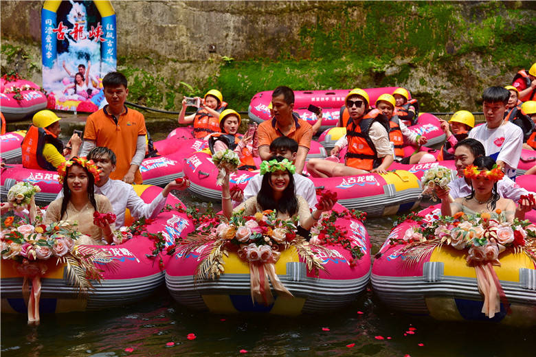 当天上午10时多,古龙峡放漂点,粉红色的漂流艇一字排开,3对新人坐在前三艘漂流艇上,99对新人依次坐在后面的漂流艇上。在船工与游客的祝福声中,新人们与恋人们的漂流艇飞流直下,直冲前方。