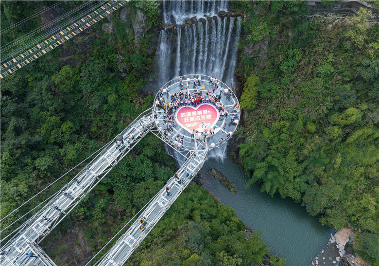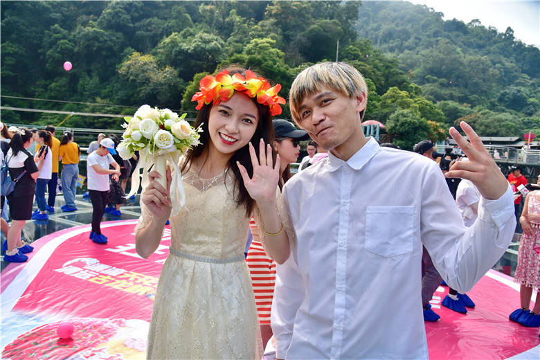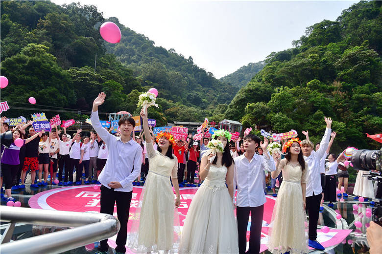 3对新人与99对伴郎伴娘完成了漂流婚礼后,还携手挑战了古龙峡景区的12项世界纪录,走过了1314米长的云天玻霸,寓意他们的爱情也可以一生一世长长久久,天然的美景俨然为新人们纯洁的爱意再添氛围。在古龙峡云天玻霸玻璃平台,大家以蓝天白云为背景,在磅礴的大瀑布前,共同许下爱的誓言,放飞象征着幸福的粉红气球。