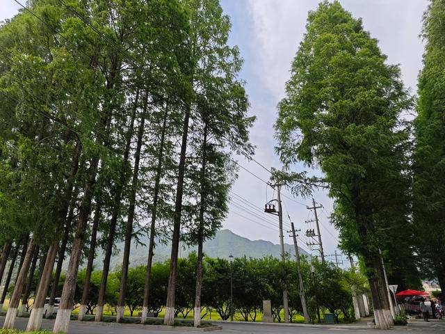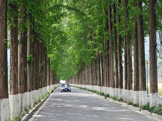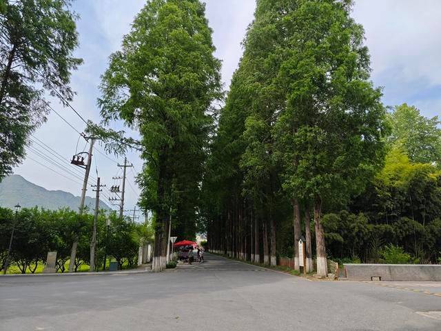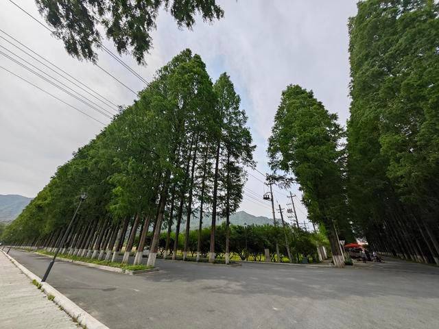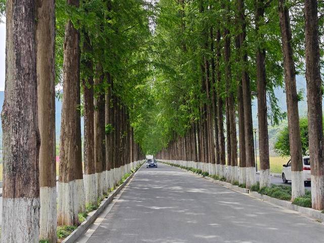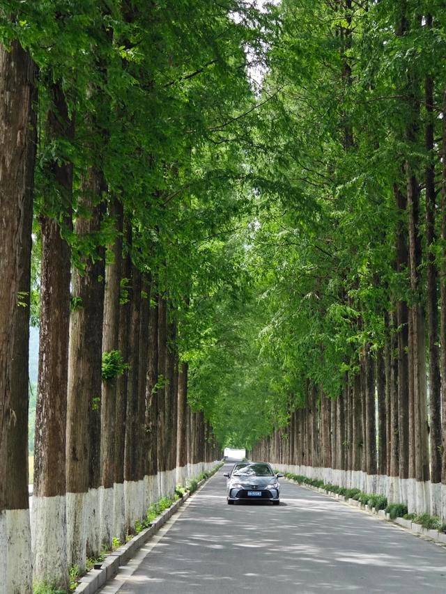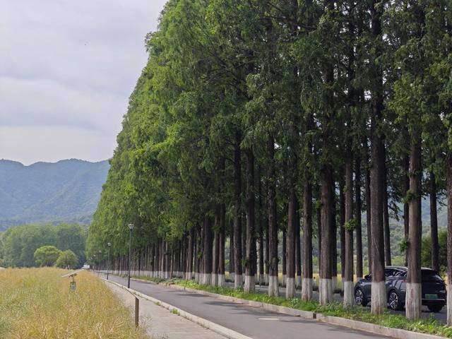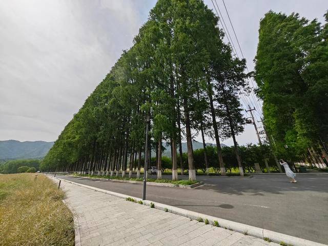 左转后,我进入了一条长长的宽阔柏油马路,两边种满了高大而整齐的水杉树,一直延伸到远处的村落。那些刚发芽嫩绿的水杉树让马路显得幽深而宁静,两旁是广阔的农田,一边的油菜花已经八成结子谢了,而麦苗却茁壮地长出绿意盎然。