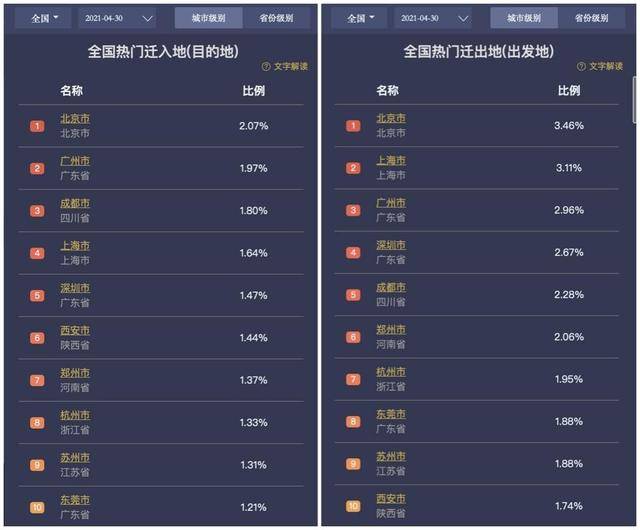 (4月30日 百度地图迁徙大数据平台热门迁入/迁出地)