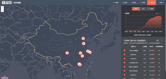 同时,大家带孩子出游的需求也越来越多,百度地图大数据今年五一还提供了游乐园人流指数数据,为宝爸宝妈们提供参考。透过百度地图大数据可以看到,带着孩子的家庭旅行在早上6点人流逐渐密集,在12:30午餐时间人流出现回落,随后又再次攀升。截至16:30,全国热门游乐场中上海迪士尼度假区、深圳欢乐谷、北京欢乐谷、广州长隆欢乐世界、南昌万达主题乐园、常州中华恐龙园排名靠前。
