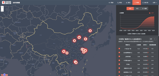 相较于选择景点外出游玩的人来说,购物是个慵懒的选择。据百度地图大数据显示,今天上午11点,排名靠前的商圈人流指数才开始超过平时数据。截至16:30,广州正佳广场、北京荟聚购物中心、上海环球港、成都IFS国际金融中心等地的人流指数较高。