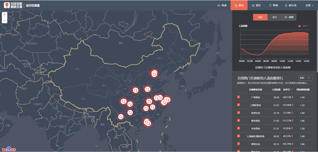 在交通枢纽人流量方面,5月1日早上4:30后各大交通枢纽人流指数便开始上涨,与拥堵里程指数显示一致;4:30-9:00期间人流指数快速攀升,之后趋势平缓但仍保持增长。截至16:30,广州、上海、杭州的交通枢纽人流分布较多,南京南站、北京西站、上海浦东国际机场、郑州东站紧随其后。
