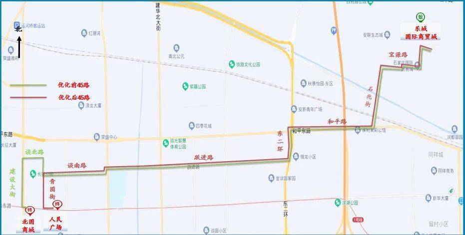 45路开往北国商城时由石兆金街临时绕行石津路、东二环、北二环、谈固大街、跃进路复原线运行,返回乐城国际贸易城时由东二环临时绕行石津路、石兆金街复原线运行。和平路临时撤销石兆路南口、橡胶厂宿舍、白佛北、国家电投站位,东二环西侧临时撤销东二环和平路口站位,跃进路北侧临时撤销银龙小区、金谈固小区、谈固东街跃进路口站位。