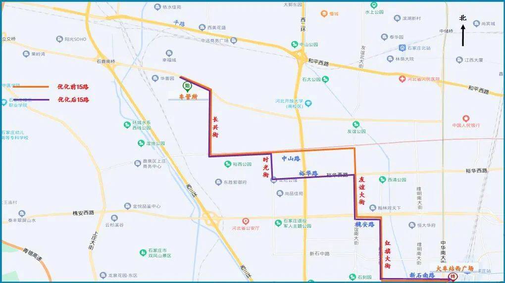3. 调后路径:新华路、长兴街、中山西路、时光街、裕华路、友谊南大街、槐安路、红旗大街、新石南路。