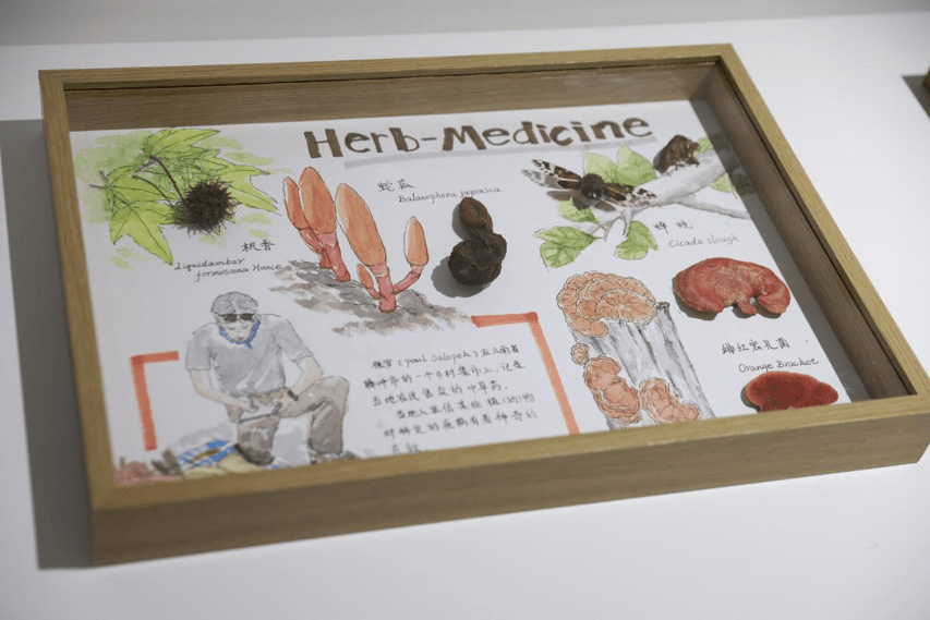 此次参加线下多媒体展览的还有10多位艺术家,既有保罗在中国的徒步伙伴,也有沿途遇到的民间艺术家等,他们通过自己的独特方式,展示中国不同地域的文化与自然景观。比如,非遗传承人李根繁⽤三弦琴演奏⽩族传统曲调,⽤声⾳分享关于劳动和情感的故事;纳西族老人杨鸿章通过象形的东巴书法讲述少数民族的故事;摄影师张宏怡用照片展示家乡云南的多元民族⽂化;艺术家张庆华则通过设计制作标本盒和分享⾏⾛过程中创作的写⽣插图,向观众传递⾃然界的智慧。