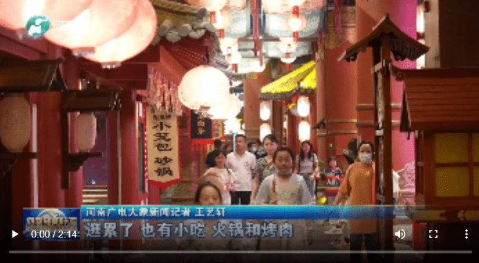 河南广电大象新闻记者 王艺轩:逛累了,也有小吃、火锅和烤肉,碰一杯冰饮料,来一场古风与现代的碰撞。