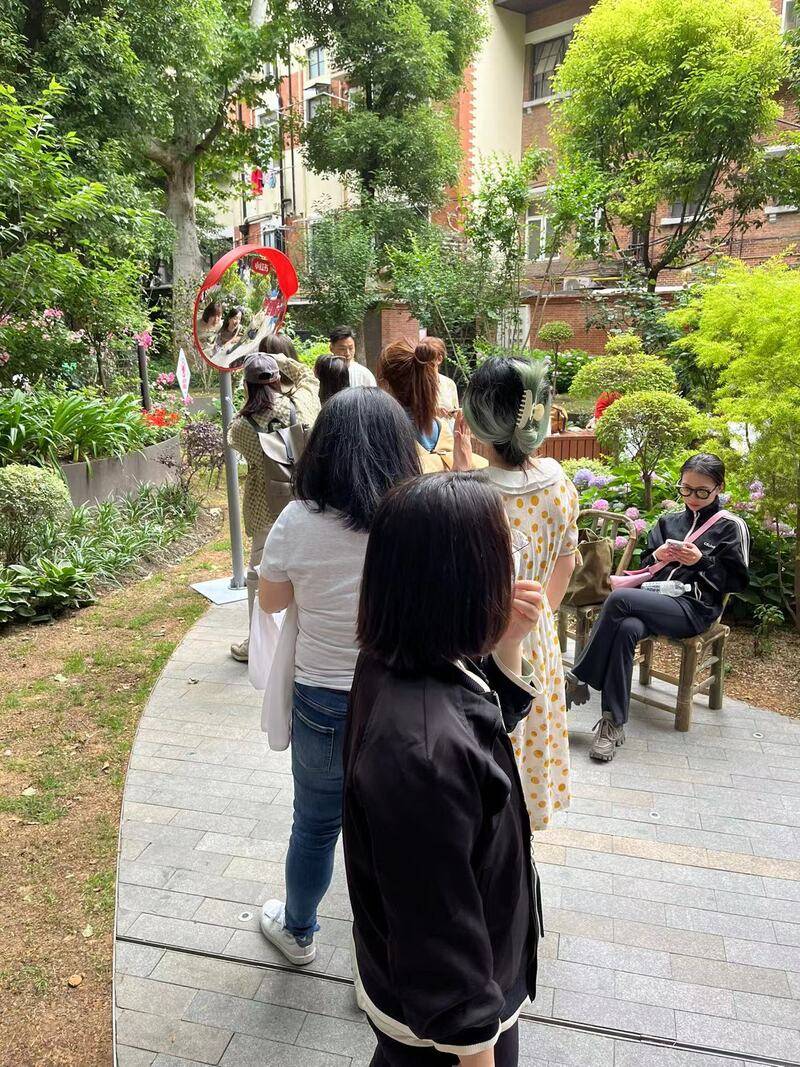 看似平平无奇的小马路上,年轻人有发现美和趣味的能力。南昌路175号隔壁的口袋公园,蔷薇、月季开得热闹。一面反光哈哈镜吸引着年轻人排队对镜拍照,镜子反射公园全貌,夸张变形的脸部在拍摄者看来也很有趣,“哪个滤镜能比这厉害?”
