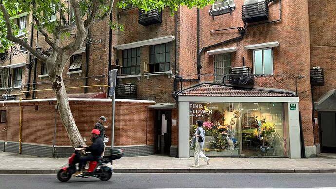 南昌路茂名路口,红砖墙在这里转了一个饱满的弧形,墙壁夹角处开出一家花店。一墙之隔是居民厨房,滋滋地冒出炒菜的声音,两只小猫从虚掩的门里探头张望。