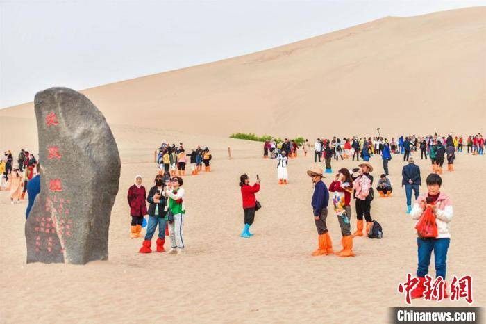 5月20日,游客在敦煌鸣沙山月牙泉景区拍照留念。
