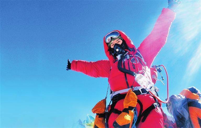 深圳登山爱好者陈芳攀登珠穆朗玛峰留影。 深圳市登山户外运动协会供图