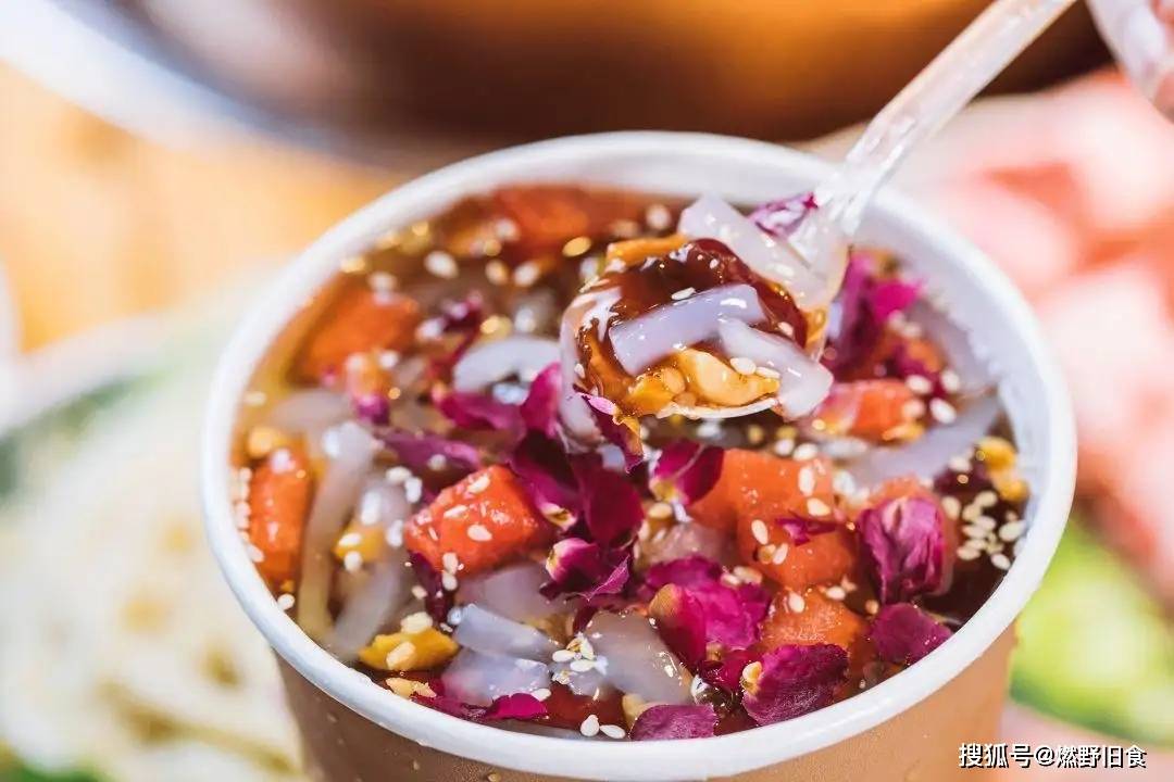 夏天一定不能错过梅香斋的冰粉,他家的冰粉是手工搓的冰粉,外表亮晶晶的,五颜六色的水果,浇上红糖和玫瑰糖,香甜清爽。