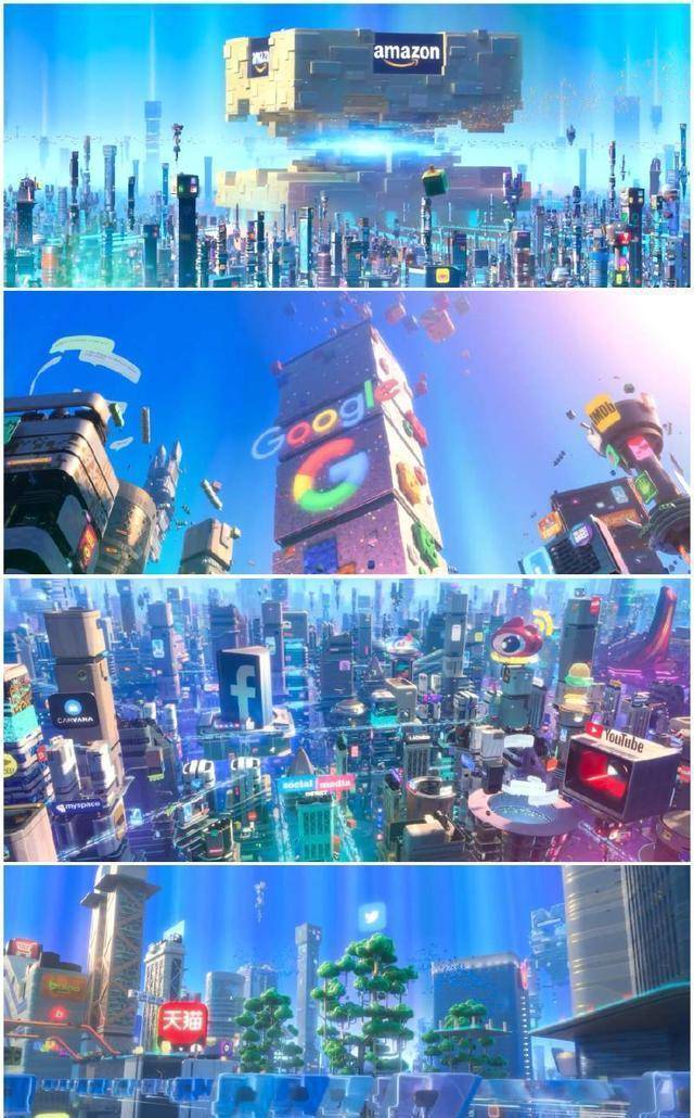 影片主人公破坏王拉尔夫本身就是游戏角色,搞笑的穿越桥段,自我价值认可的主题,影片至今在豆瓣还维持着8.6的高分,而迪士尼动画本部也是这部作品开始,一连推出了《超能陆战队》《冰雪奇缘》《疯狂动物城》等高口碑高票房的动画大片,迎来新的高峰。而上一次主角们还是在游戏世界中穿梭,这一次则直接穿越到了互联网的世界中,因为来到互联网,在穿越的过程中也是各种植入: