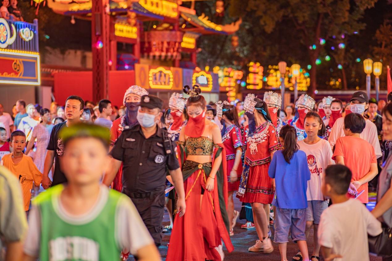 除此之外,街区的特色演艺也是氛围感的主力担当。湘西不夜城从湘西当地民间习俗、神话传说中选取创作素材,打造出《千年一面》《上铃鼓》《翩飞舞韵》《苗银之华》《湘西秘境》《姻缘一线牵》等众多原创舞台演艺,在悠扬舒缓的古风乐曲中,古典唯美的演艺翩然舞动,营造出岁月静好、人间太平的氛围感,让过去三年经历过太多不确定性的人们,得到心灵的抚慰与治愈。