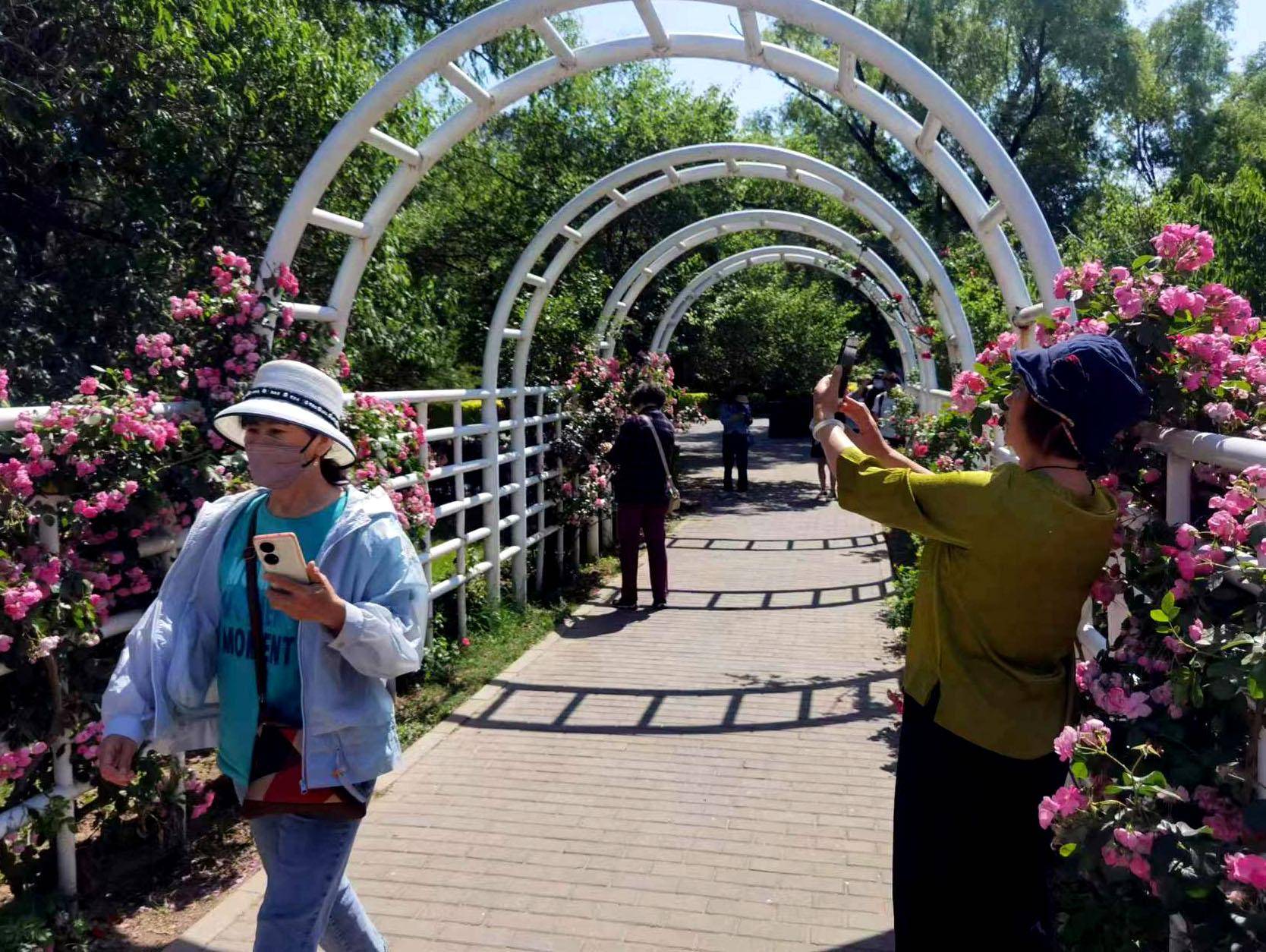 5月22日,游客在国家植物园(北园)月季园内欣赏盛开的树状月季、微型月季、丰花月季等品种的月季花。国家植物园(北园)月季园作为2023年北京月季文化节8个展区之一,每年5月起,月季园中群花开始怒放,绰约的花姿,芬芳的花香,令人流连忘返。本报记者 吴镝摄