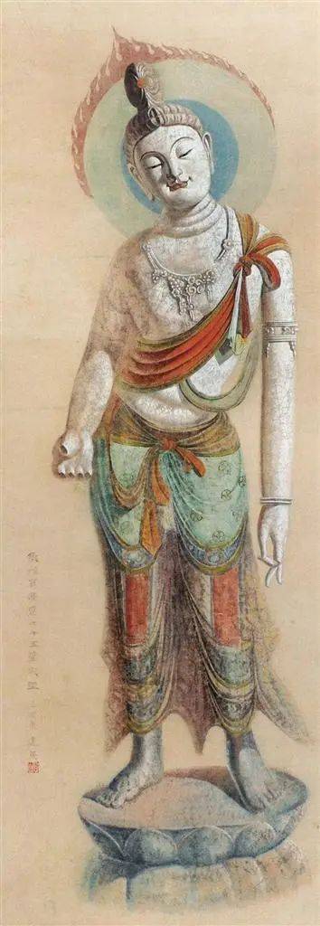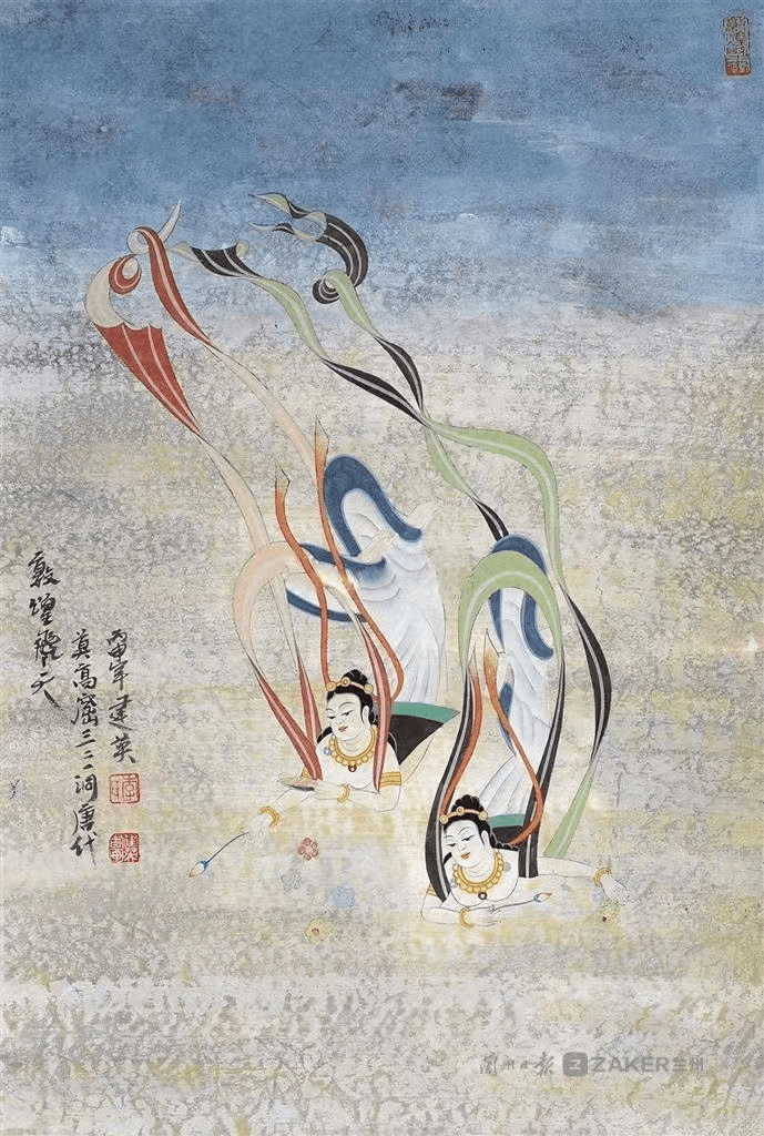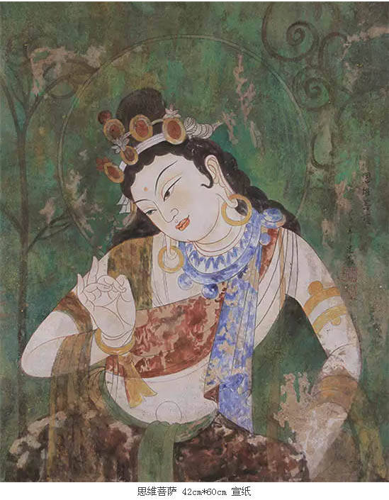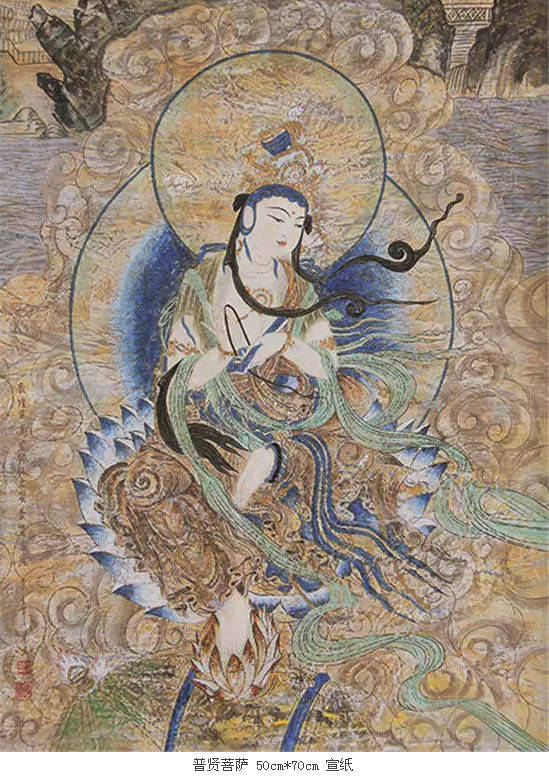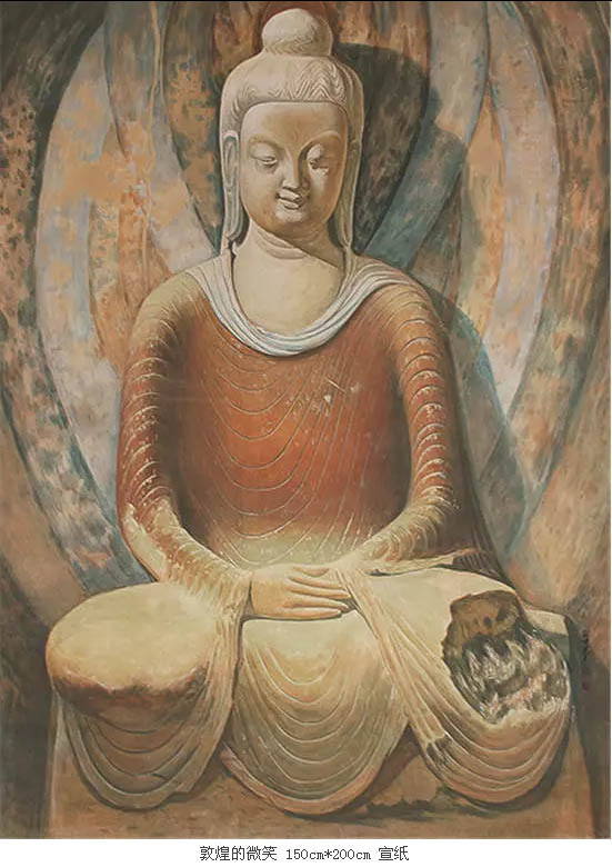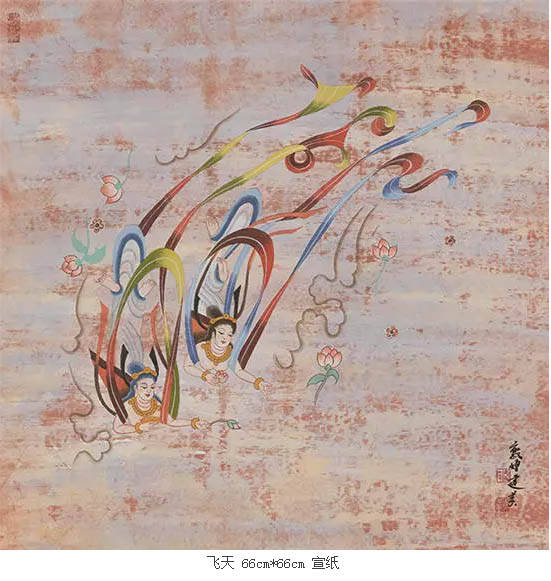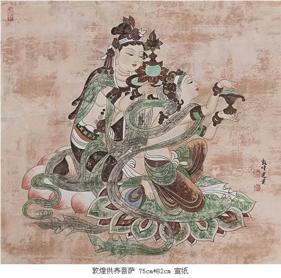 李建英笔下的天女菩萨、飞天伎乐,形象丰颐典雅、雍容端庄,他以富有节奏感的线条,遵循传统,但不拘泥于传统的表现方式,勾勒出了天女菩萨婀娜多姿的体态与翩若惊鸿的舞姿,菩萨端庄且微笑的面容,似乎在表达和芸芸众生之间的沟通。精美的古代彩塑在宣纸上运用肌理和光影的立体写生表现方式,使人更加惊叹中国画与敦煌艺术相结合所表现出的独特魅力。