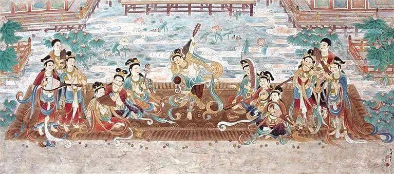 走进李建英的画室,一种古朴、厚重而绚丽的气息扑面而来,一幅幅大小不一且色调通透观者心灵的画作挂满四壁。李建英创作的敦煌画汲取莫高窟壁画的艺术养分,在宣纸上呈现出一种具有立体感、雕塑感的空间美。这不是对敦煌壁画的简单翻版,而是注入和凝聚了新鲜有力的情感力量,将有限的平面范畴转化为敦煌艺术新的形态,构成一种高雅、洁净、优美、和谐的现代艺术之美。