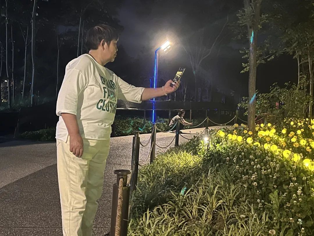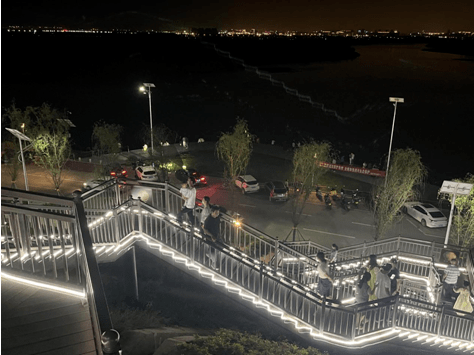 当夕阳的余辉徐徐跌落泾渭河,夜幕开始降临,寻着兴趣,沿两边棕红色的观赏桥下至河堤路,便是河面,流水静深。回身仰望,映入眼帘的修剪整齐的绿植,巨大的“泾渭分明”四字灯带造型镶嵌其中,让夜幕下的观景台更添意境,仿佛链接着另一个童话世界。近水了,心情放松的人们,或坐着纳凉,或运动健身,或拍照合影,或直播打卡…柔和的灯光里是孩童咿咿呀呀学着走步,扑鼻的花香里是情侣们的温言细语,星星点点的夜空下是劳累了一天的人们难得的放松惬意,人群来回穿梭、处处欢声笑语,到处上演着生命力的蓬勃之气,此时,大自然的秀丽壮观与现代人文的打卡空间在这里相融交织,编织成独属于“泾渭分明”的美丽与浪漫。