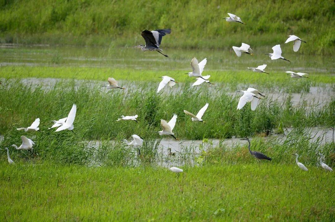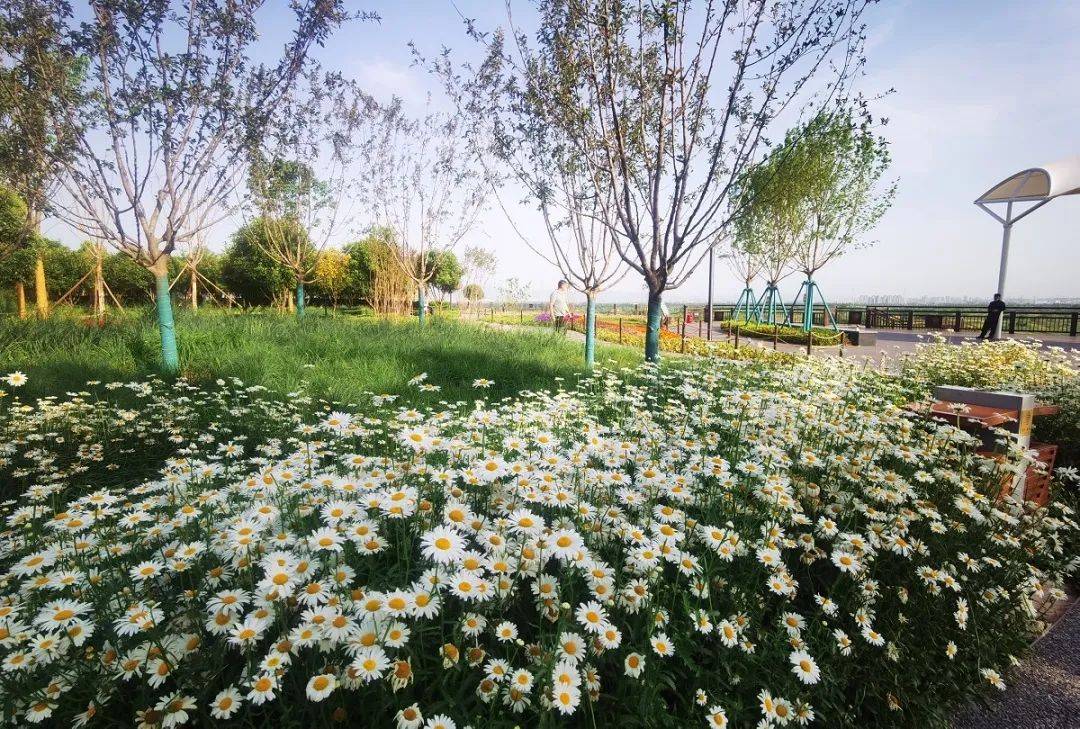 这个傍晚,凉风徐徐,约三五好友,携父母幼童,沿着蜿蜒的亲水步道,便进入这现实版的绿野仙踪,只见黄白相间的雏菊花海随风摇曳,大叶女贞、栾树、国槐错落有致,风吹树叶婆娑的声音声声入耳,河面上层层鳞浪随风而起,袅袅水汽萦绕而上,成群水鸟盘旋撒欢儿,涟漪声、鸣叫声、戏水声不绝于耳,让人们的心不自觉变得平静,畅快地呼吸着清新湿润的空气,好不惬意,美得像是一幅精致而婉约的山水画卷。