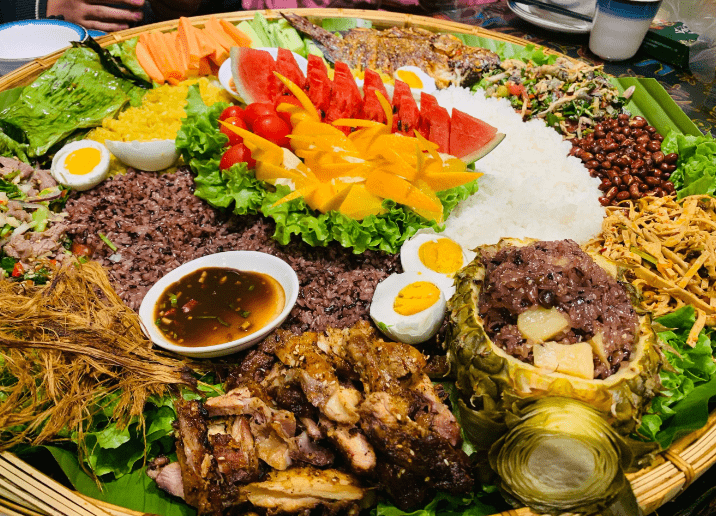 傣味手抓饭是傣族的盛宴,是云南傣族地区的传统美食,手抓饭色彩斑斓,香气四溢,口感丰富多样。吃傣族手抓饭是不用筷子和碗的,就用手抓了吃。它是先在桌子上铺一层冼干净的芭蕉叶,然后上菜,菜是对称摆放,讲求摆盘艺术。摆放的菜品种类多样,荤素搭配,可以说是色香味俱全。