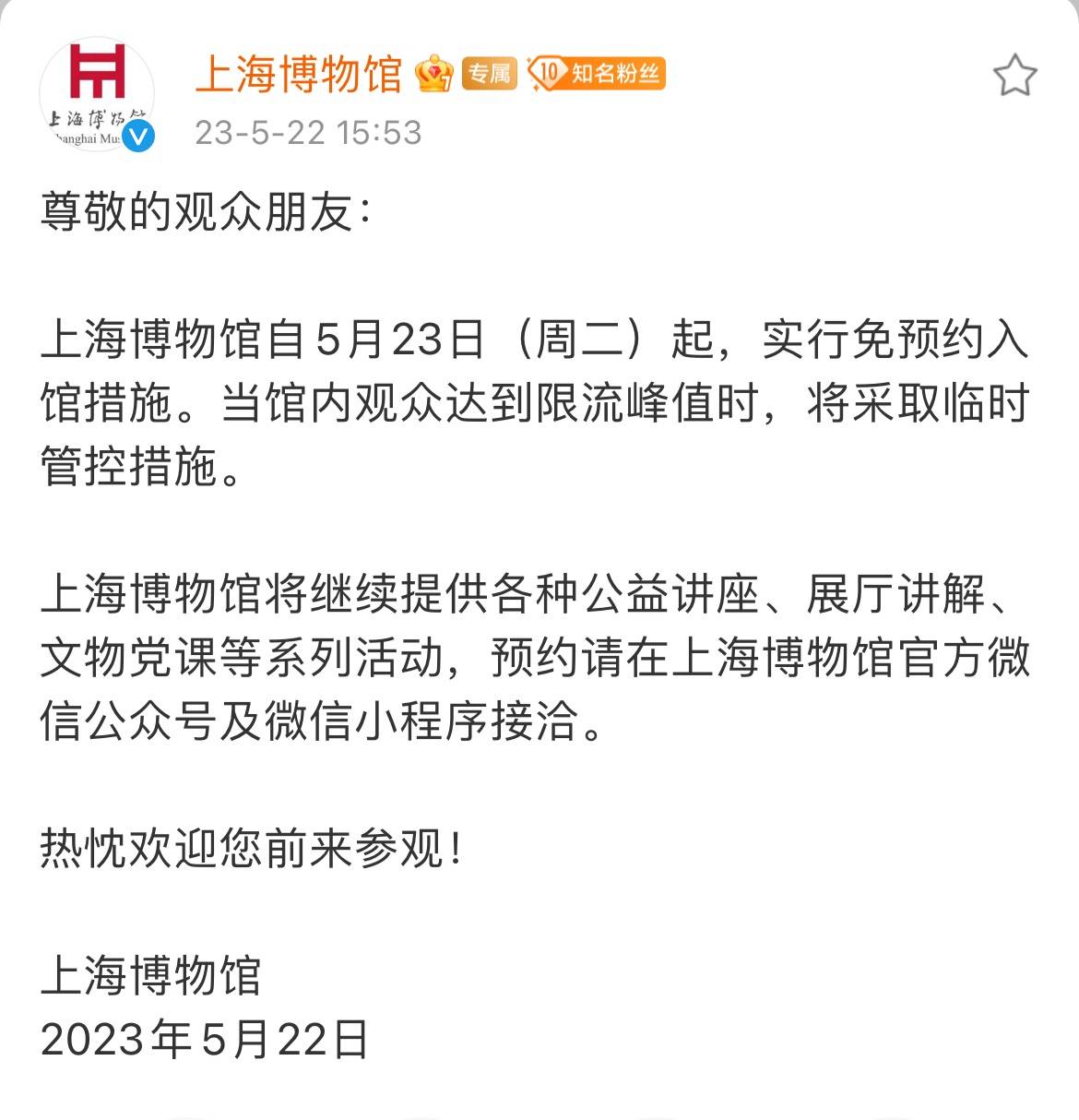 东方网记者包永婷5月22日报道:上海博物馆官方微博刚刚发布消息称:上海博物馆自5月23日(周二)起,实行免预约入馆措施。当馆内观众达到限流峰值时,将采取临时管控措施。