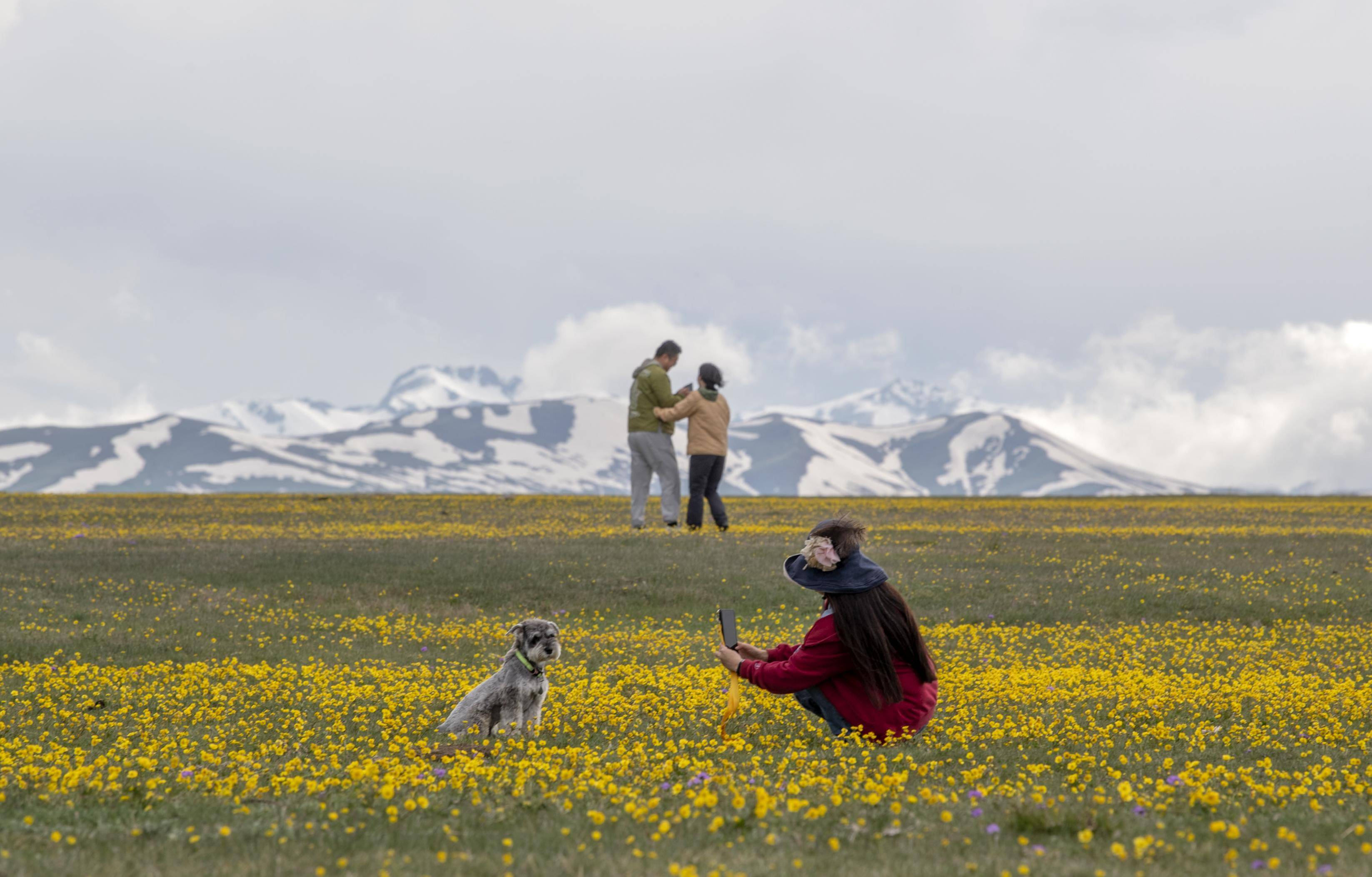 5月21日,一位游客在新疆赛里木湖景区为宠物狗留影。 新华社记者 王菲 摄