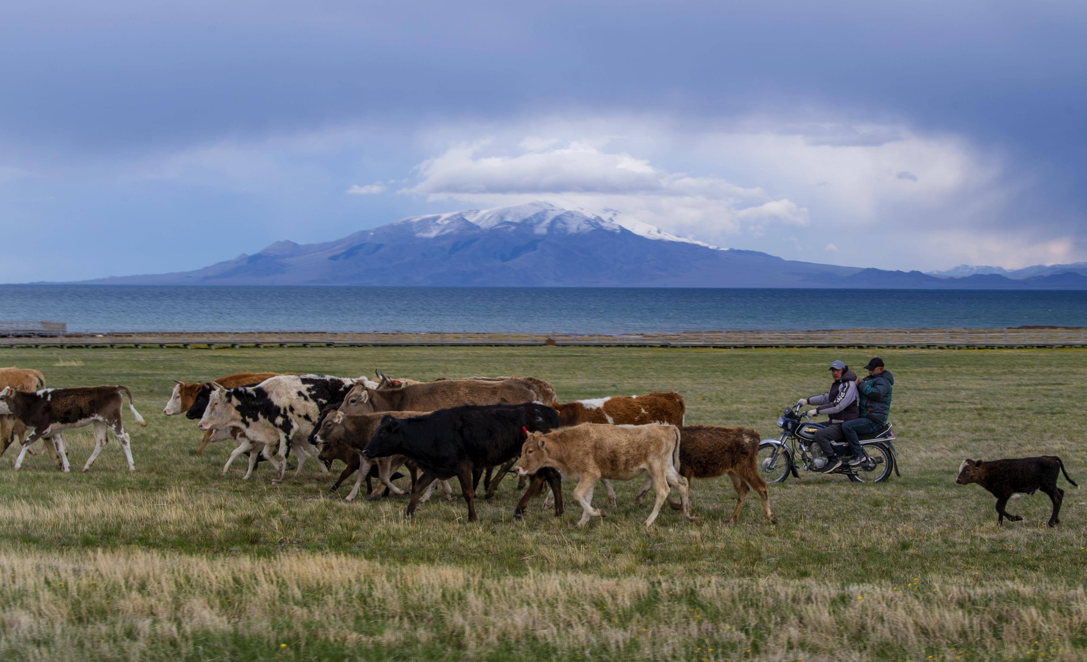 5月21日,牧民在新疆赛里木湖边放牧。 新华社记者 王菲 摄