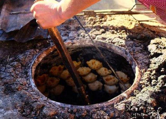 新疆的馕坑不但可以烤肉,还能烤包子。借助馕坑火的辐射热和坑壁的高温烤制出来的包子,可以说它是包子中的上上品。新疆烤包子的面皮非常的薄但又不会太硬,烤了之后皮特别酥脆,也不会干巴巴的。馅是肥瘦相间的羊腿肉加羊尾巴油,加上切成丁的洋葱,再撒一点胡椒粉和孜然粉,特别鲜香。轻轻咬开,满满的汤汁蹭蹭地往外流,鲜美可口,吃完真是满足到不行。