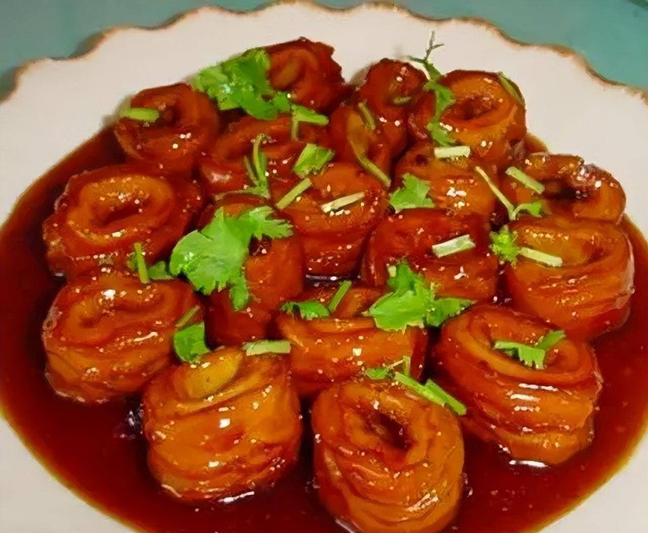 山东九转大肠被誉为是山东济南的经典名菜之一。出锅以后的九转大肠不仅仅像成熟的水果那样色泽丰满红润,也像弹簧一样富有弹性,外形形状还像千层饼一样,层次分明,一层接着一层。让人吃起来的口感既觉得嫩嫩的,还不会让人感觉到油腻恶心。味道绝美,香气飘香,就是经常吃,也会觉得吃不够。