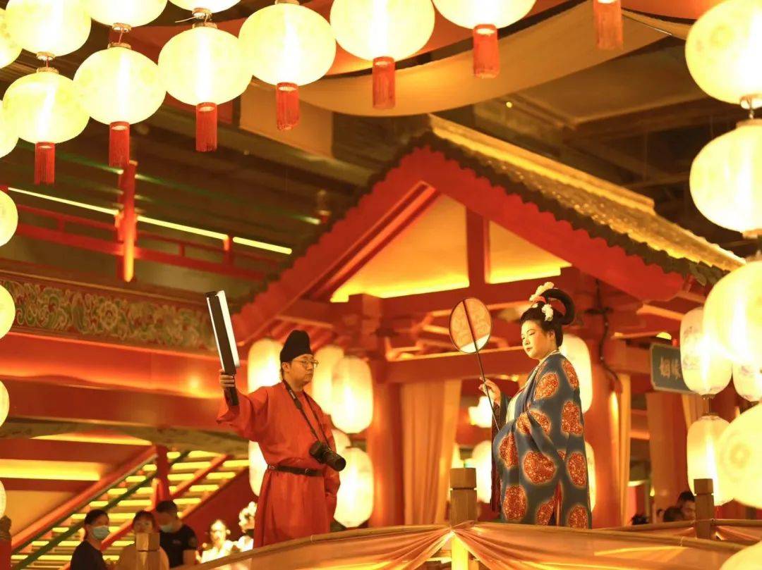 游客在星河里唐宫夜宴实景文化主题街区拍照