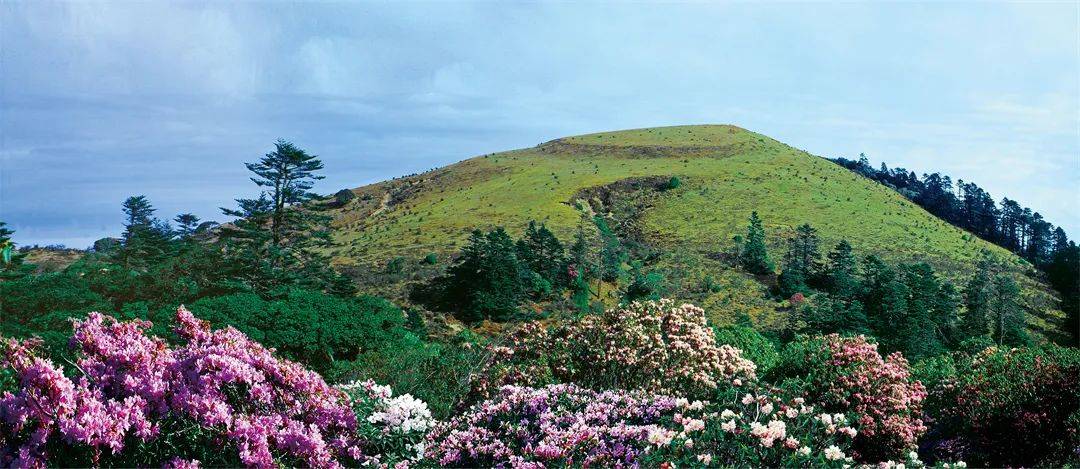 这里的杜鹃花种类繁多,红的、粉的、紫的、黄的、白的各色花儿,争奇斗艳,像鲜红亮丽的云霞一般,把百草岭簇拥成五彩缤纷的花岭,漫步山间小径,人在花中行,画由景中生,无不让人心旷神怡。