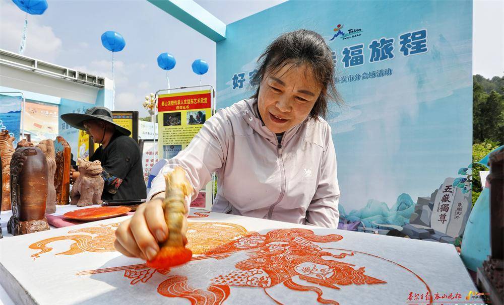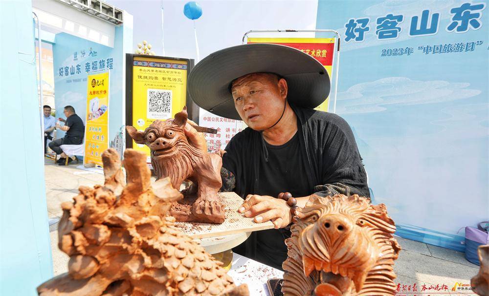 山东山水壮丽、文化厚重,既揽自然之美,又得人文之韵。活动现场设置了“好客山东山东有礼”展区,展示非遗民俗、美食盛宴等旅游特色产品,市民游客可以在这里参观非遗“礼”、好品“礼”、美食“礼”。泰山石刻、泰山赵英剪纸、泰山泥塑、大汶口花边技艺、新泰师旷古琴5家非遗项目在展区内进行了展示。在泰山赵英剪纸展位前,一位游客侧立在旁,赵英正在为她制作人物剪影。一两分钟后,剪影就被制作了出来,栩栩如生。“剪影做得很精细,很漂亮。”这名游客拿着剪影高兴地说。