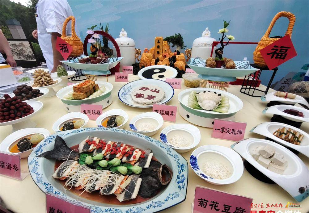 作为五大宴席之一,泰山豆腐宴带来了四美碟、四配碟、九道主菜,以精美的菜品形式展现了泰山特色美食文化。“旅游日是大家旅游开心的日子,今年山东的分会场设置在了泰安,我们这次参加活动带来了泰安有代表特色的宴席——豆腐宴。”泰安东岳泰山豆腐宴文化研究院理事长王小刚介绍,泰山豆腐宴是将历代帝王登封泰山时御用菜品中豆腐菜精华,经过挖掘、整理、传承、发展集合而成,形成了今天的四美碟、四配碟、九道主菜。“吃豆腐有‘都有福’的寓意,来到泰安,欢迎大家来品尝豆腐。”王小刚说。