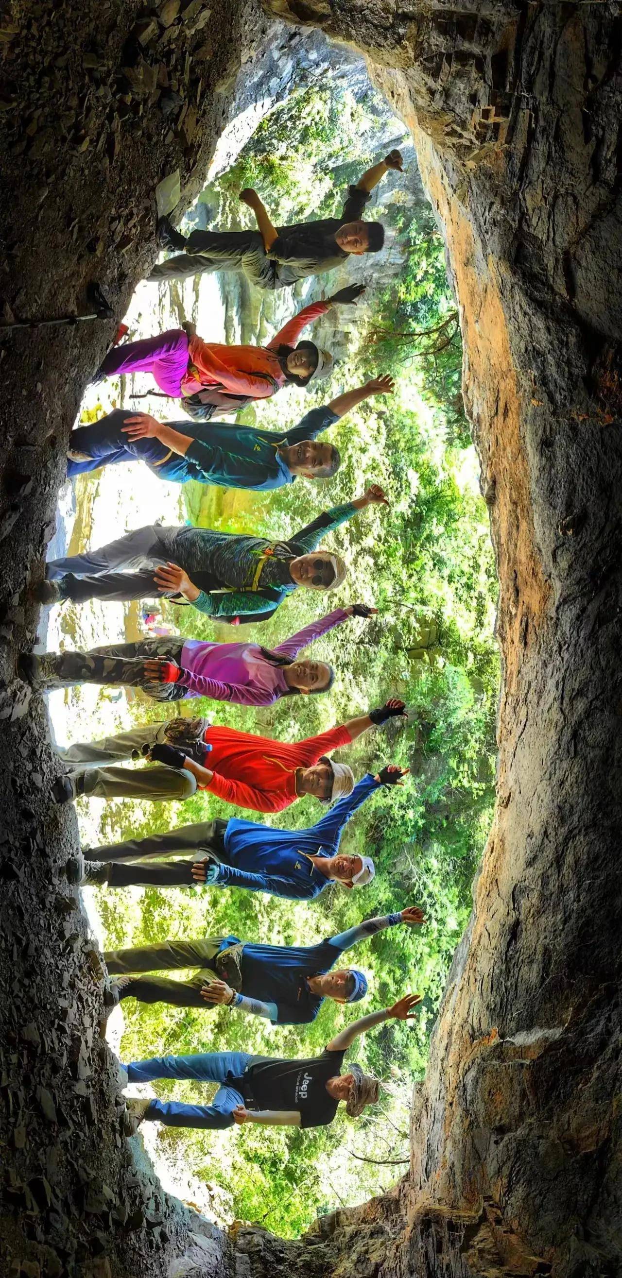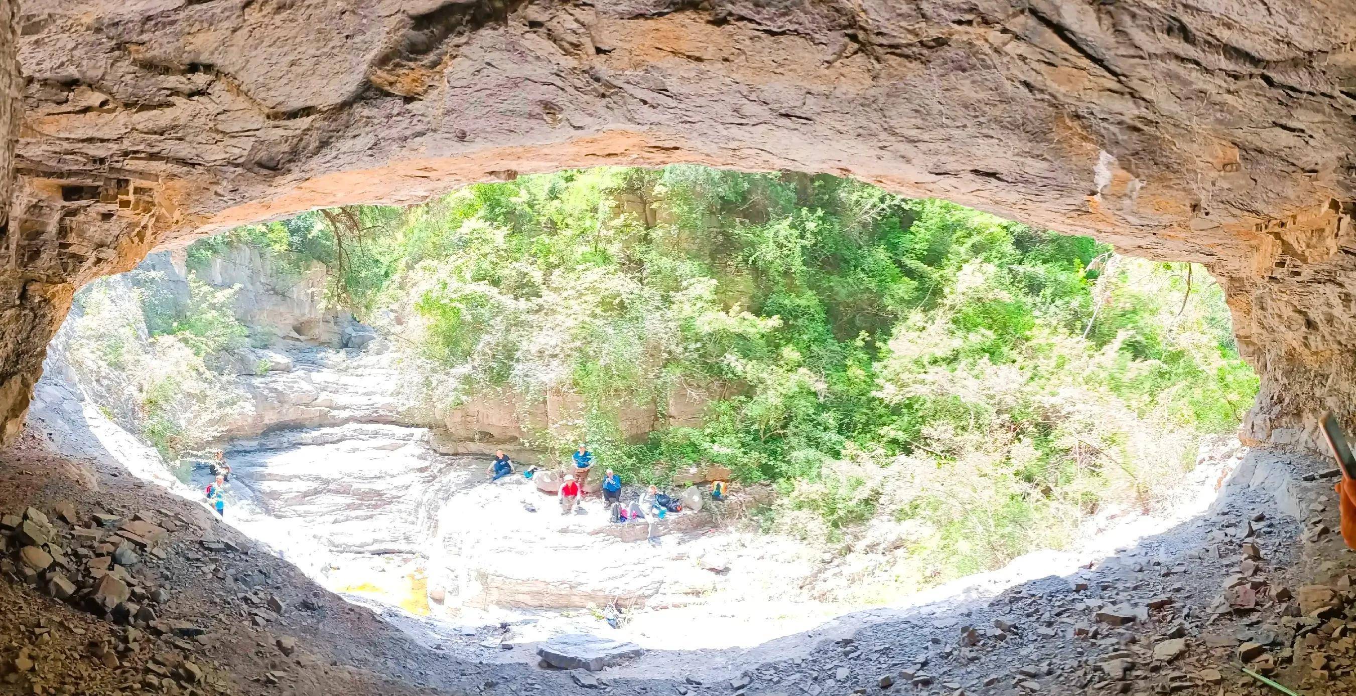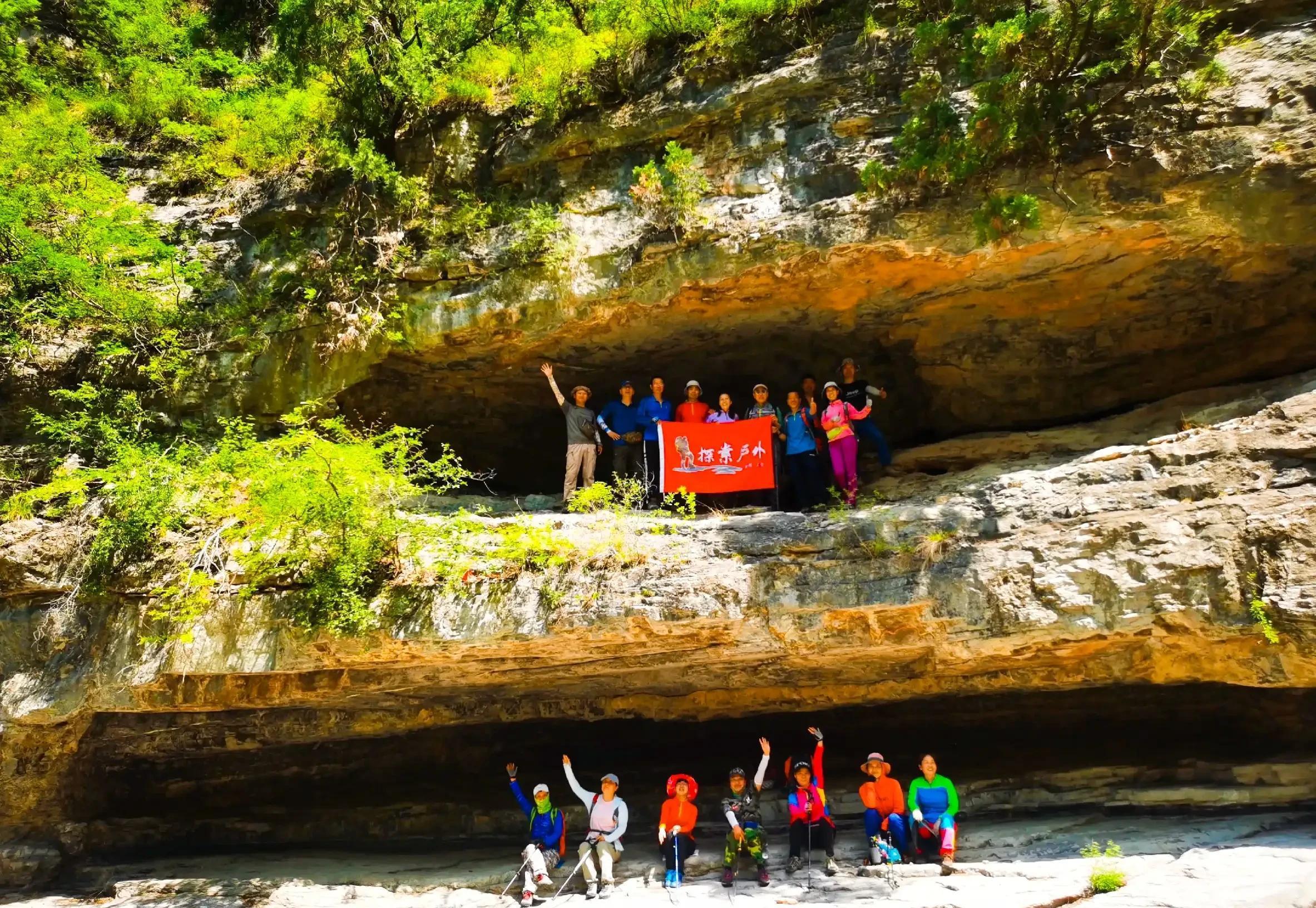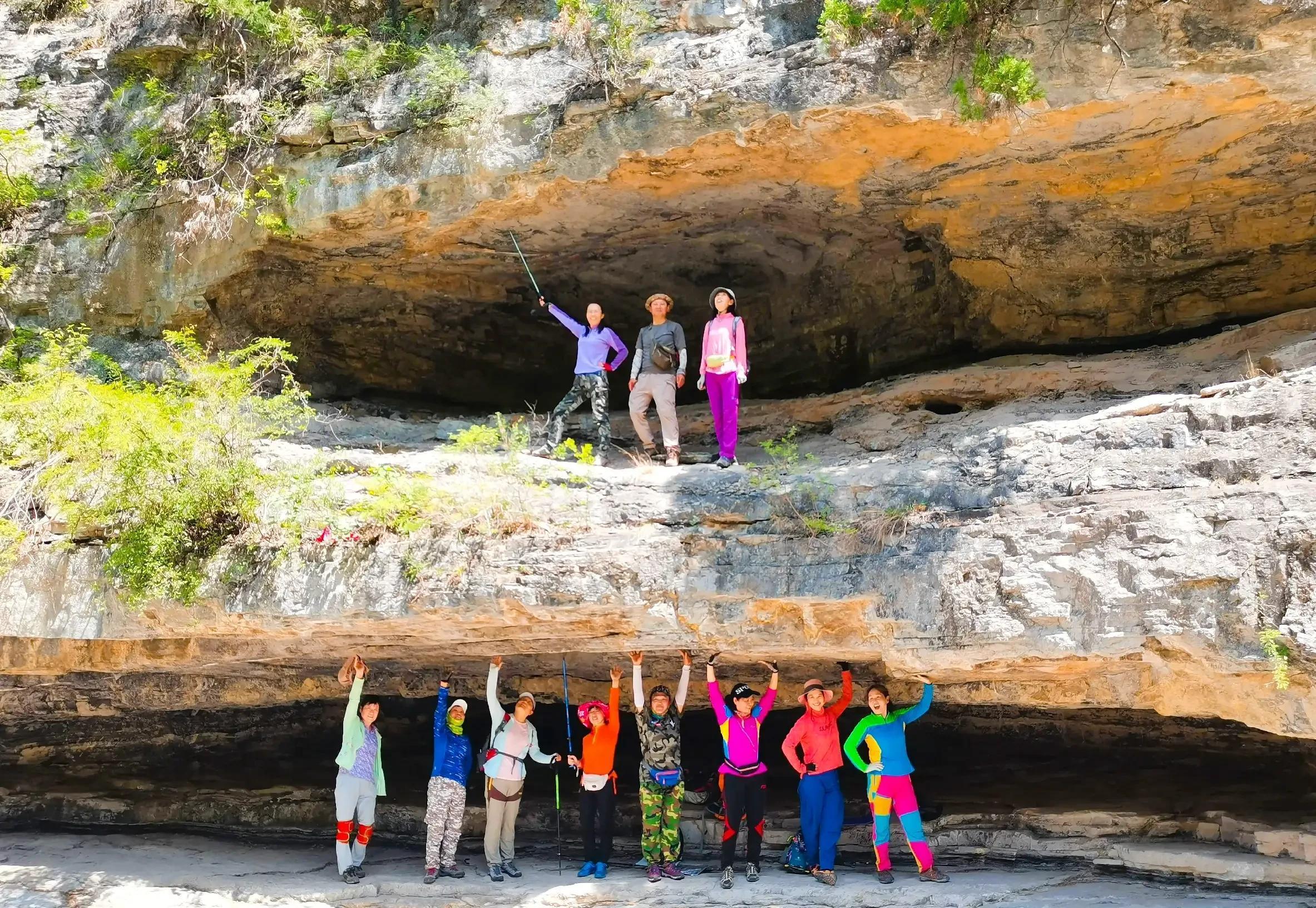 10:30分走到二道棚,仔细看,峡谷河道从这里拐了个弯,这是不同时期的流水斡旋,磨痕,风剥雨蚀,最终形成了独具特色的上下两层山洞。