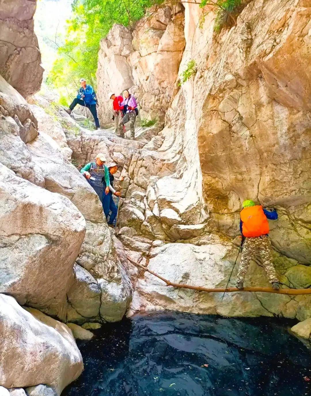 12:35分开始慢爬,一处峡谷漩涡凹陷处,坑内水深不详,靠岩石右边走,有前驴友搭设的一根树枝,脚踩枯树枝,紧靠崖壁,可轻松过。