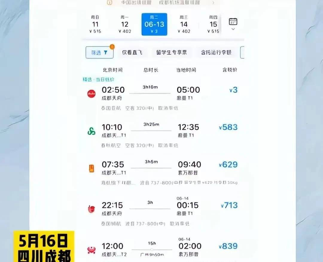 成都到曼谷机票3元一张?别不信!成都王女士还真买着了,实打实的哦,没有套路,真实出票了,网友可羡慕了,这是比坐地铁还便宜啊?