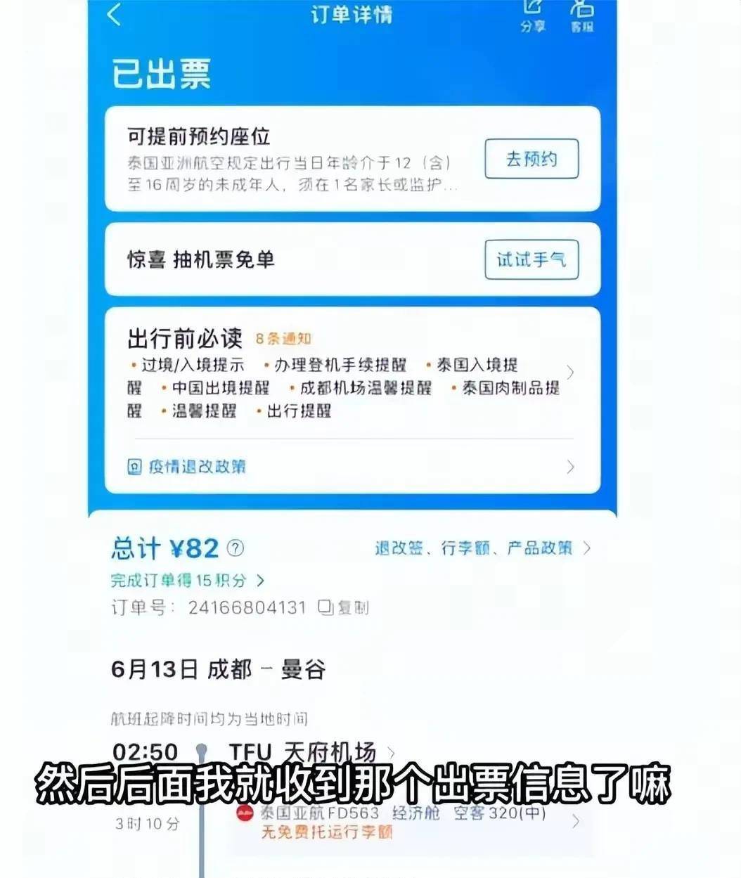 事件经过:成都王女士最近有去曼谷的打算,近期一直关注特价机票,之前一般都在三百多(也便宜的很),最近一天收到推送消息只要3元一张,虽然忘女士有点担心是假的(毕竟假的也就几十块钱),但还是毫不犹豫定了两张,加上税费一共82元一张。