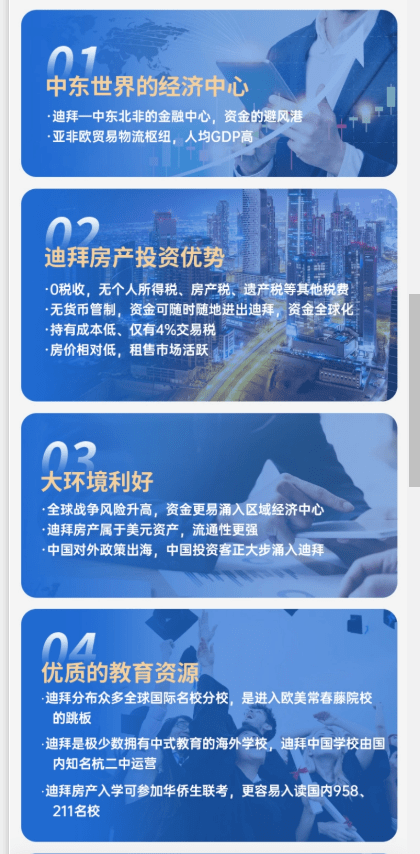 此外,搜狐财经发现在网络上某迪拜房产公司推介直接打出了5点优势:包括资金避风港、大环境优质教育、一家三代签证享受本地人社会教育、医疗保障等福利。
