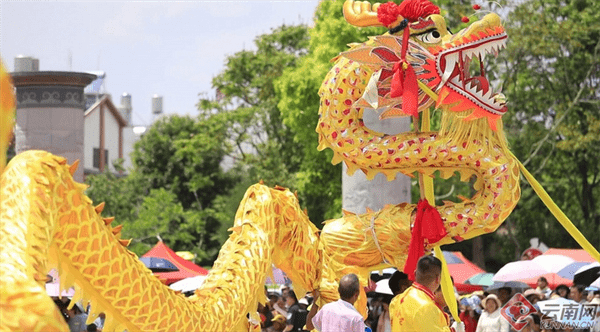 舞狮结束后,在悠远的鼓声中,黄龙、青龙、麻龙入场,这些龙气宇轩昂、威风凛凛、欢快庆贺。这几条大龙均来自施甸县仁和镇五楼社区,每条龙至少需要60人才能舞动起来,表演者都是来自仁和镇五楼社区的村民,他们无不使出看家本领,表演着这独特的传统文化节目,为中国旅游日增添了浓浓的喜庆气氛。