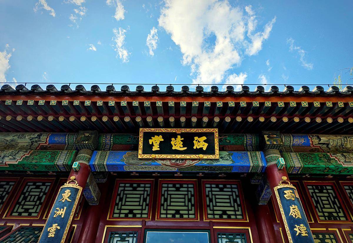 仰拍下的谐趣园的正殿--涵远堂,对比相机拍照来说天空蓝与建筑的暗,手机拍的更讨喜而省心。