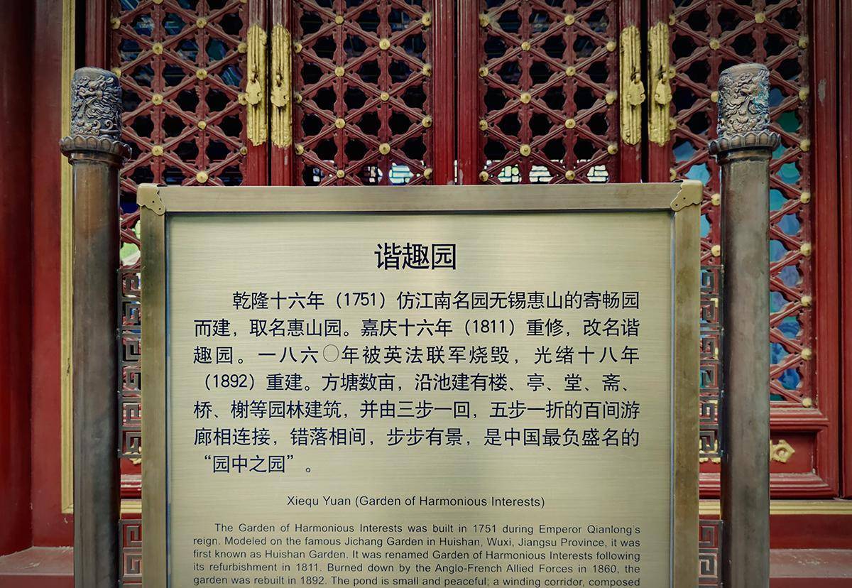 景点介绍:谐趣园原名惠山园,是清代乾隆十六年(公元1751年)仿无锡惠山江南风格的私家园林寄畅园建造的。嘉庆十六年(1811年)修复时,嘉庆皇帝改名为“谐趣园”,取义为“以物外之静趣,谐寸田之中和”。