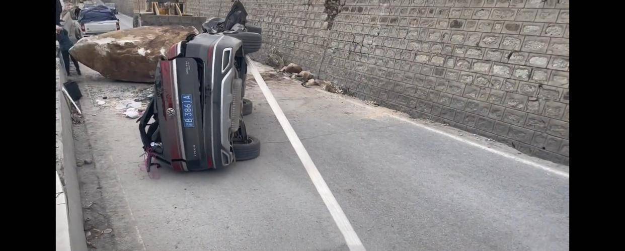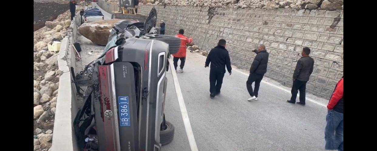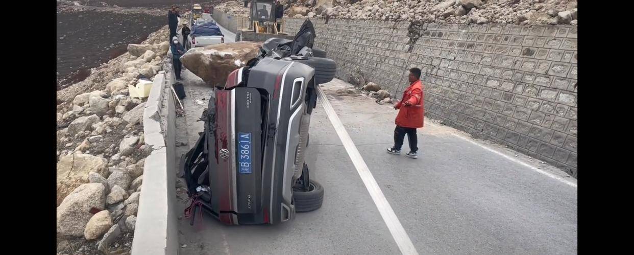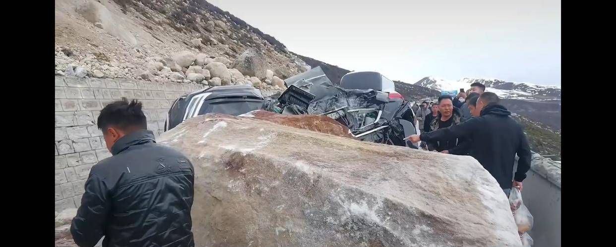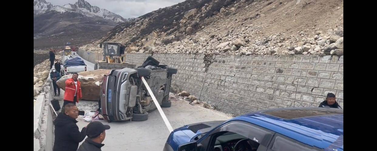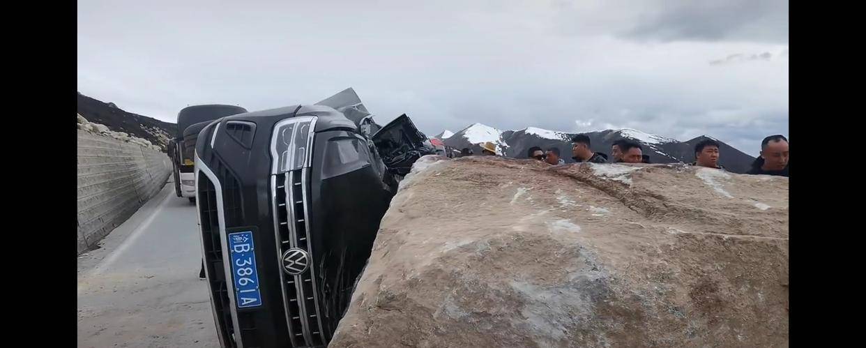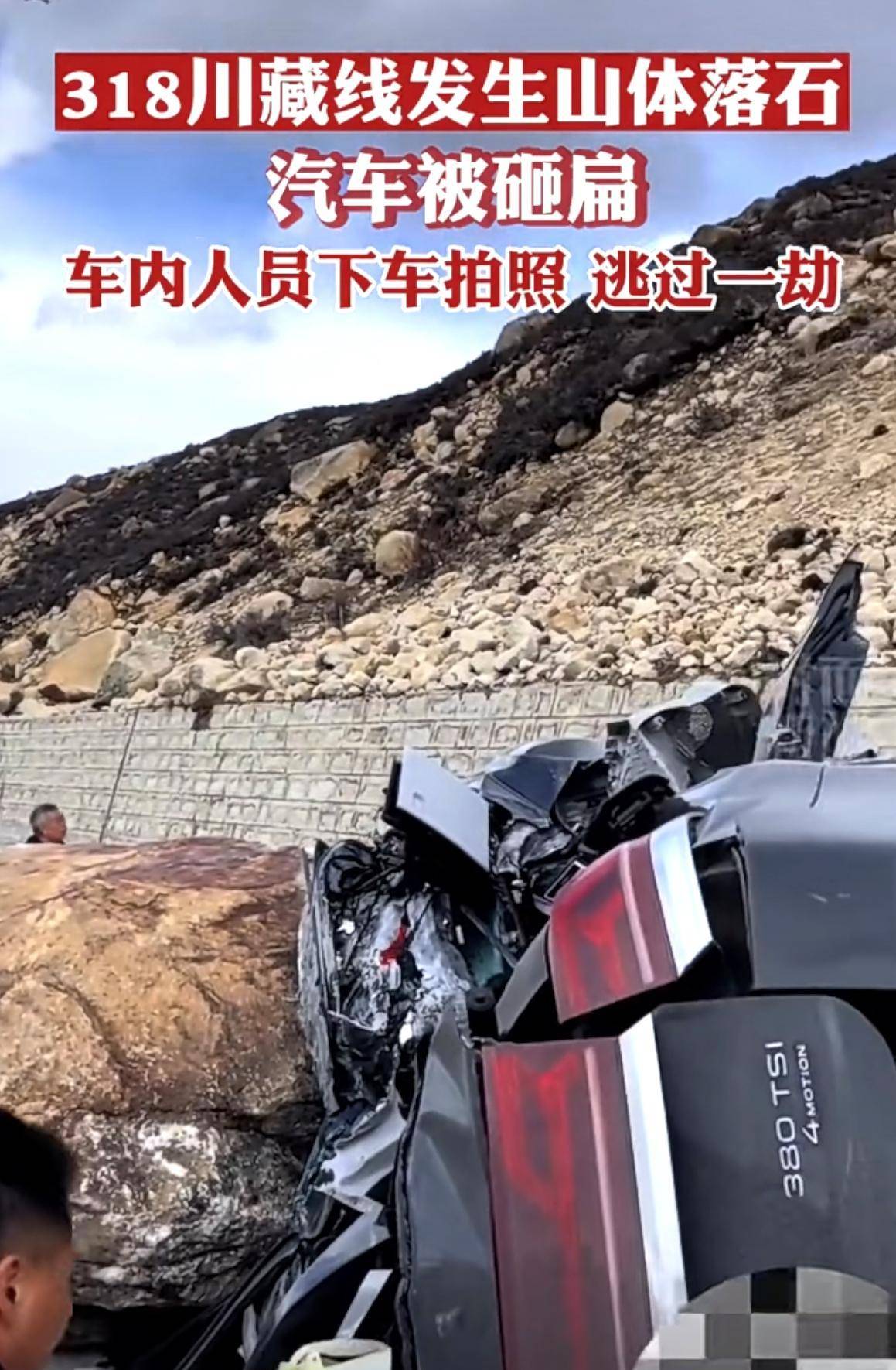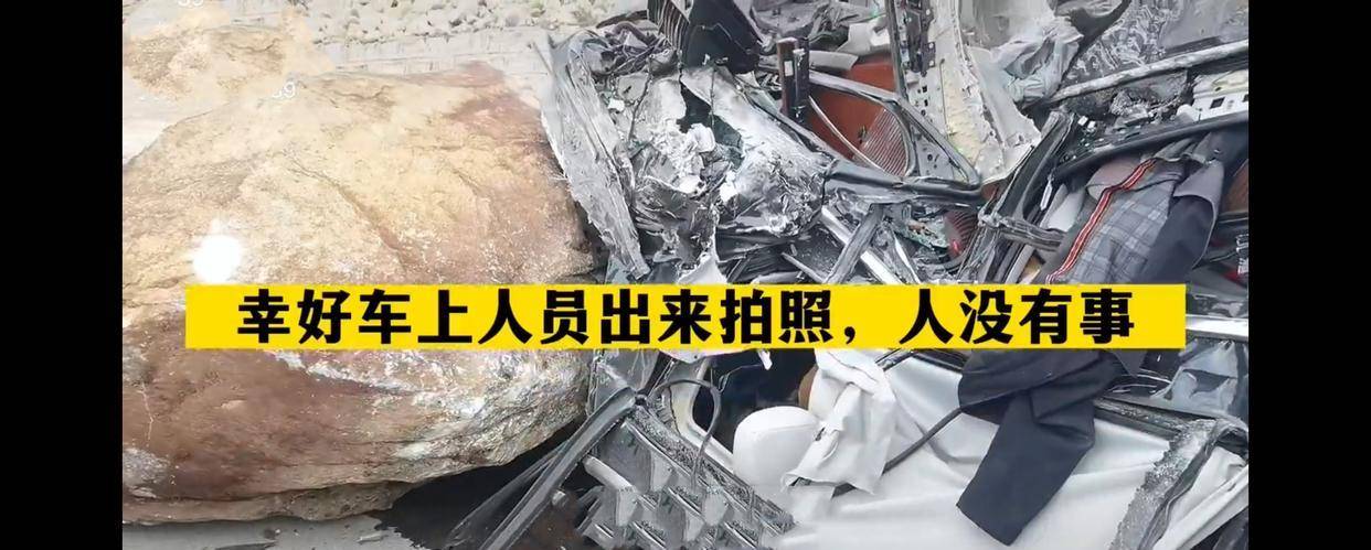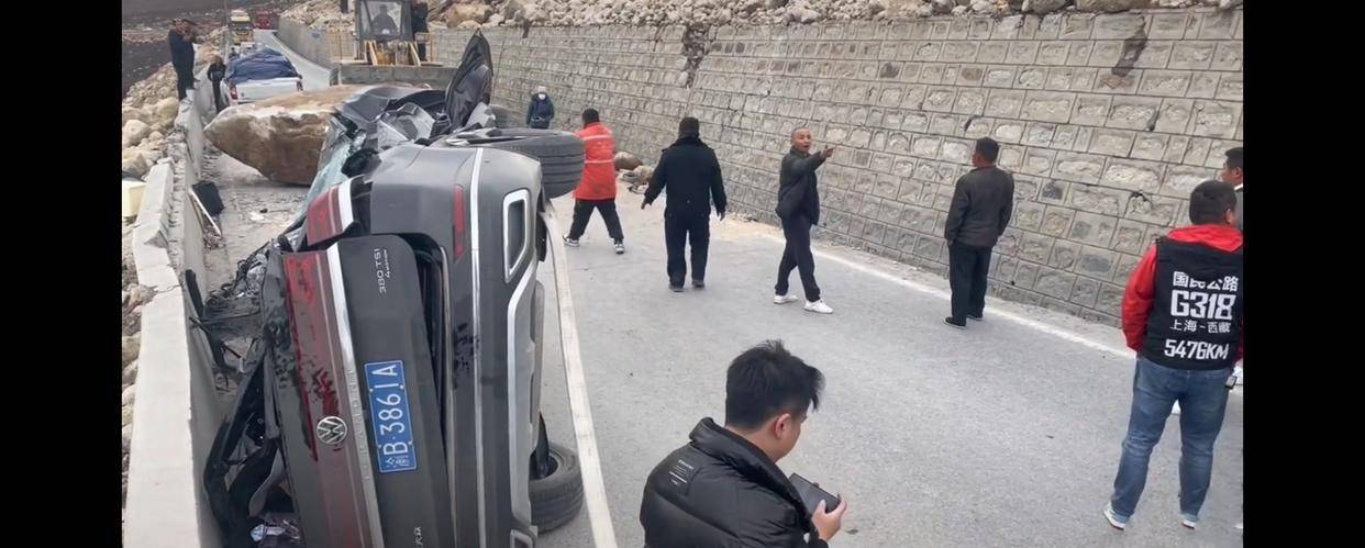 #318川藏线巨石滚落砸烂一轿车#