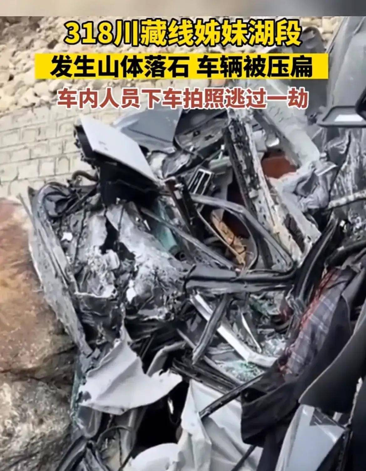 2023年旅游热门,现在自驾游西藏路上已经出现堵车情况,2023年5月16日一路人自驾游318川藏线,在四川甘孜藏族自治州318路上姊妹湖路段出现堵车,忽然轰隆一声巨响从山顶滚落巨大一块几十吨落石,直接冲下山崖砸中路上一辆轿车,轿车被砸扁,瞬间报废,看了视频隔着屏幕胆战心惊,肆肆发抖。