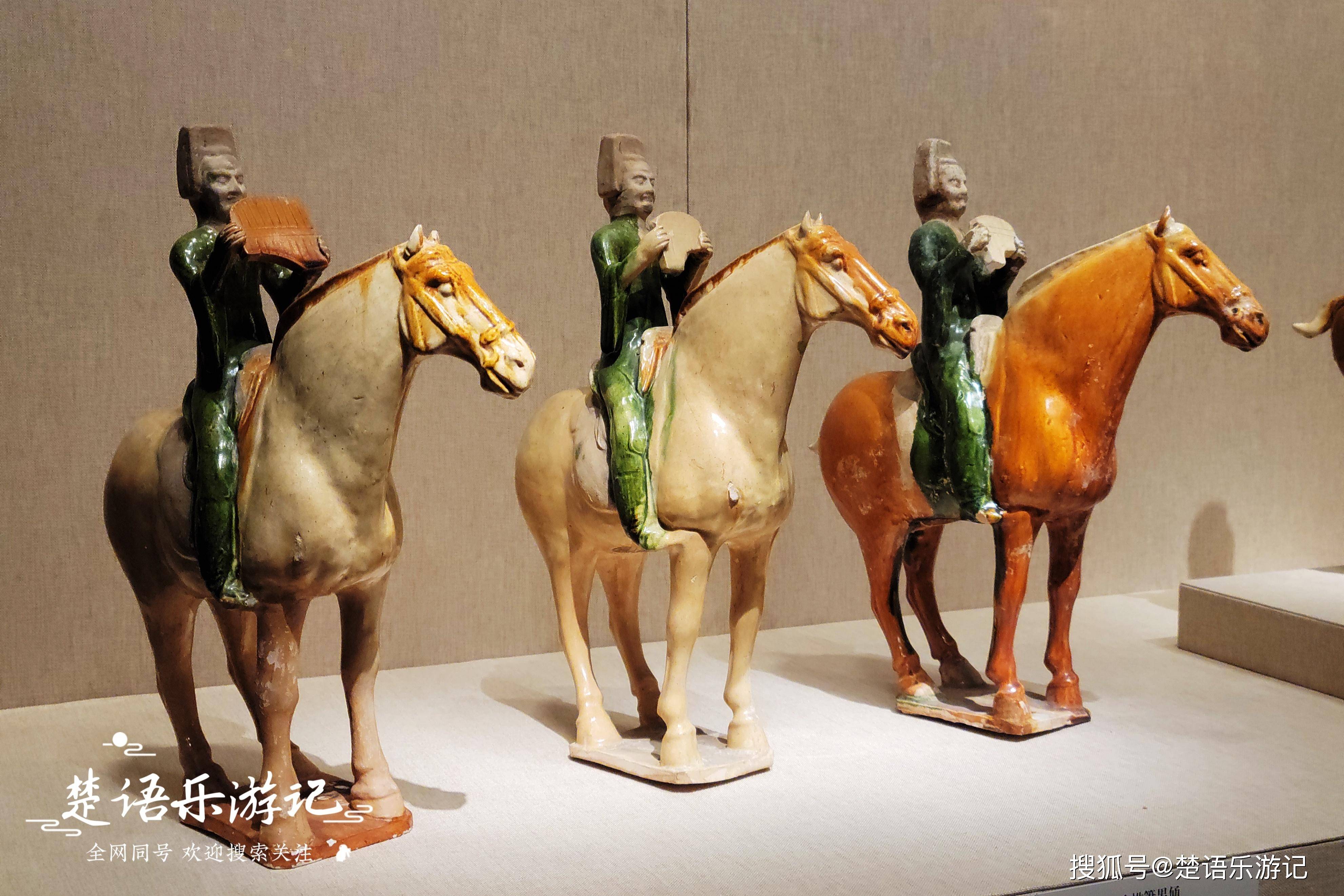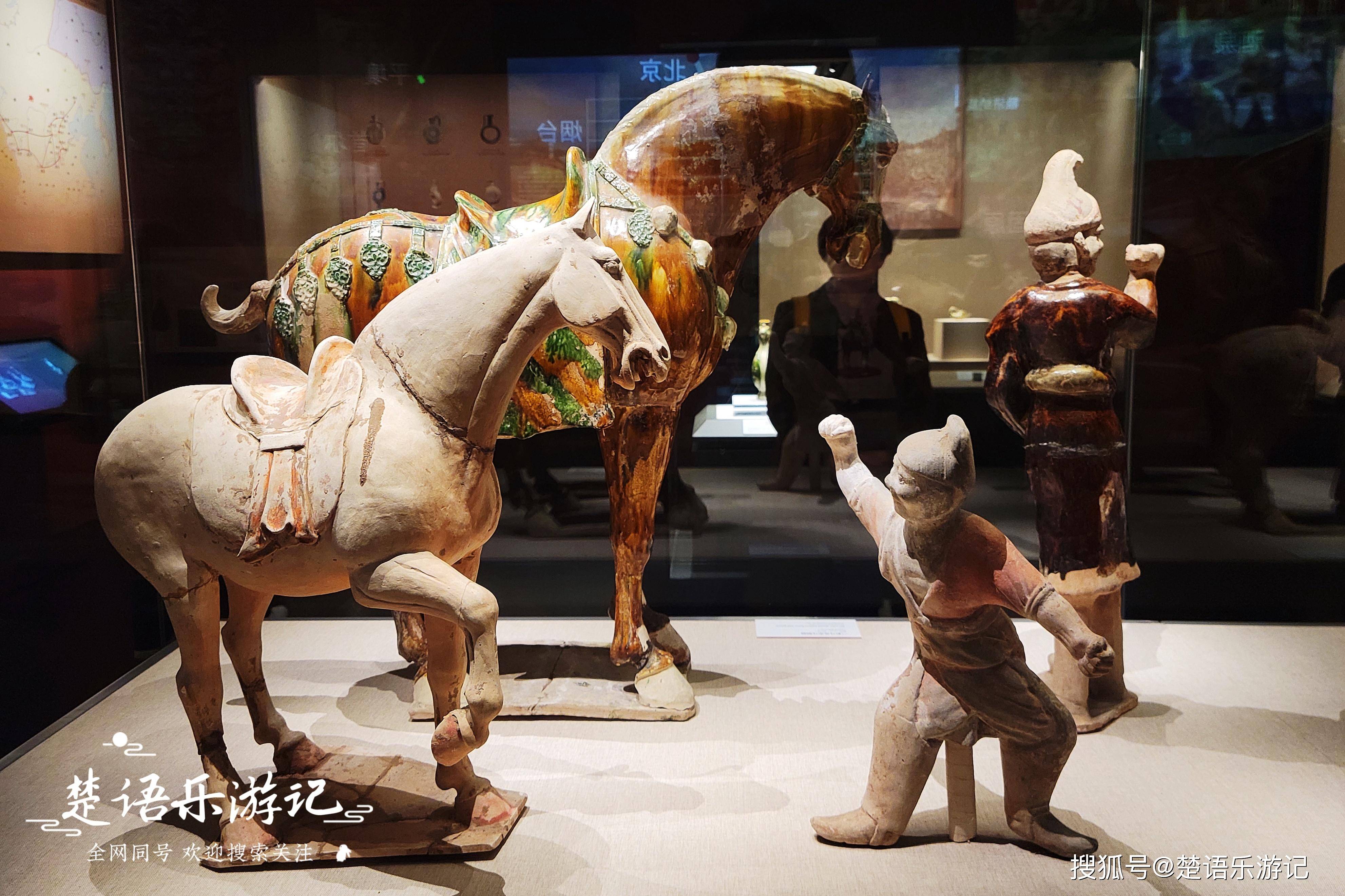 除了这九件镇院之宝,展馆里的其它宝贝也都值得仔细欣赏。比如这里的唐三彩,不论是三彩轿车、天王俑,还是三足炉、宝相花纹盘,都很精绝,色彩鲜艳,制造工巧。